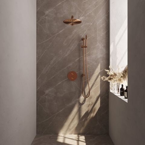 De set is uitgevoerd in geborsteld koper met een PVD-coating. Deze afwerking zorgt ervoor dat de kleur langdurig mooi blijft en beter bestand is tegen krassen. Het gebruikte materiaal is duurzaam messing, wat bekend staat om zijn stevigheid en kwaliteit. De thermostaat zorgt ervoor dat de watertemperatuur constant blijft tijdens het douchen. Je bedient de drie verschillende uitgangen (hoofddouche, handdouche en eventueel een extra optie) via het 3-weg inbouwdeel, dat al is inbegrepen. De set heeft een rechte muurarm voor de hoofddouche en een flexibele doucheslang. Er zijn geen verschillende straalsoorten, dus de waterstraal is altijd gelijkmatig. Dit product is verkrijgbaar in meerdere afwerkingen: chroom, geborsteld goud PVD, geborsteld gunmetal PVD, geborsteld koper PVD, geborsteld RVS PVD en mat zwart.