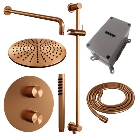 De set is uitgevoerd in geborsteld koper PVD. De PVD-coating zorgt ervoor dat de matte koperkleur langdurig mooi blijft en beter bestand is tegen krassen. Het basismateriaal is messing, wat bekend staat om zijn duurzaamheid. De set bestaat uit een ronde hoofddouche van 30 cm, een gebogen muurarm, een staafhanddouche, een flexibele doucheslang en een geïntegreerde glijstang. De thermostaat zorgt ervoor dat je eenvoudig de gewenste temperatuur instelt en houdt deze constant. Het inbouwdeel is inbegrepen, wat de montage vereenvoudigt. Deze set is verkrijgbaar in meerdere afwerkingen: chroom, geborsteld goud PVD, geborsteld gunmetal PVD, geborsteld koper PVD, geborsteld RVS PVD en mat zwart.