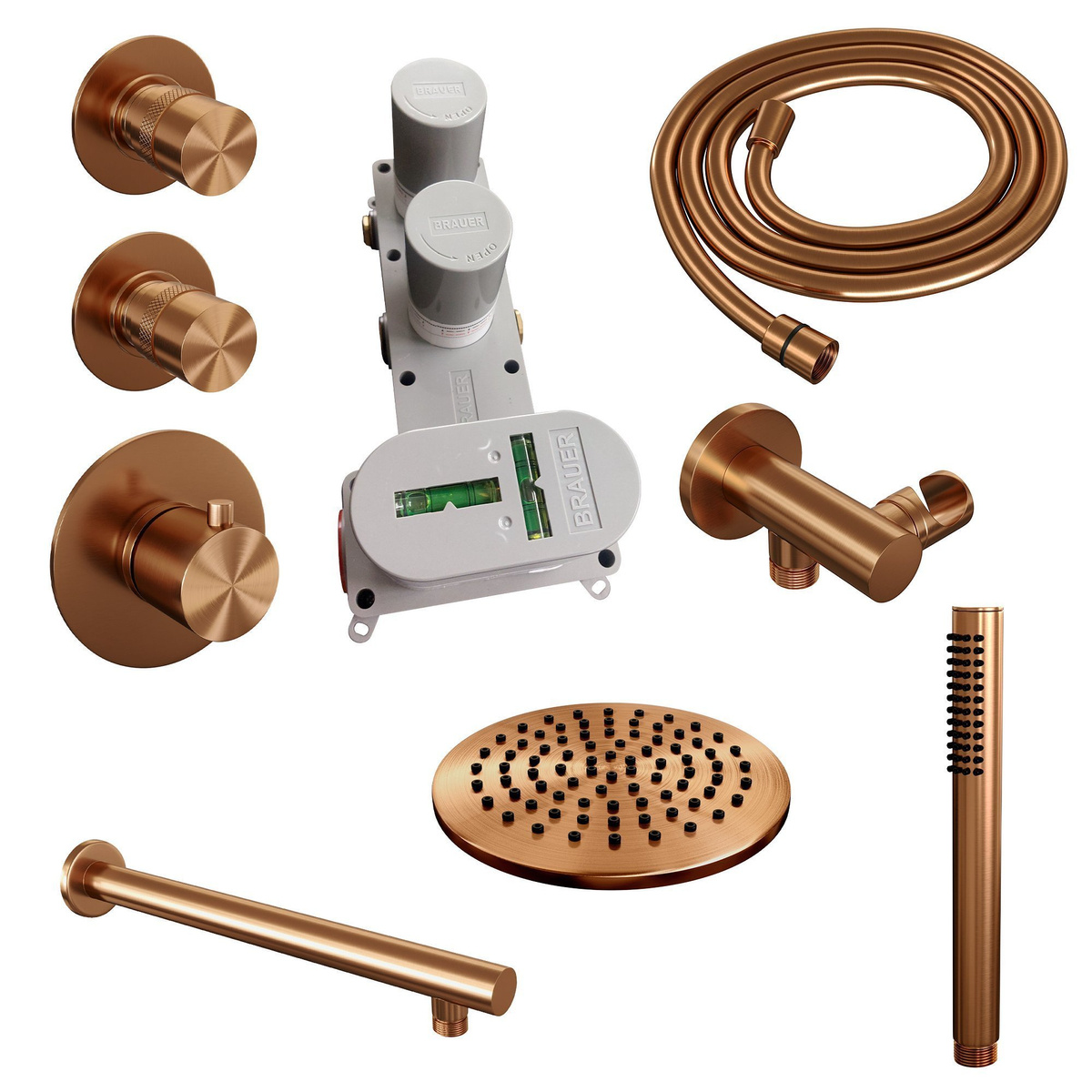 Brauer Copper Edition Regendoucheset inbouw - hoofddouche 20cm - 3 gladde knoppen - rechte wandarm - Staafhanddouche - Geborsteld koper PVD