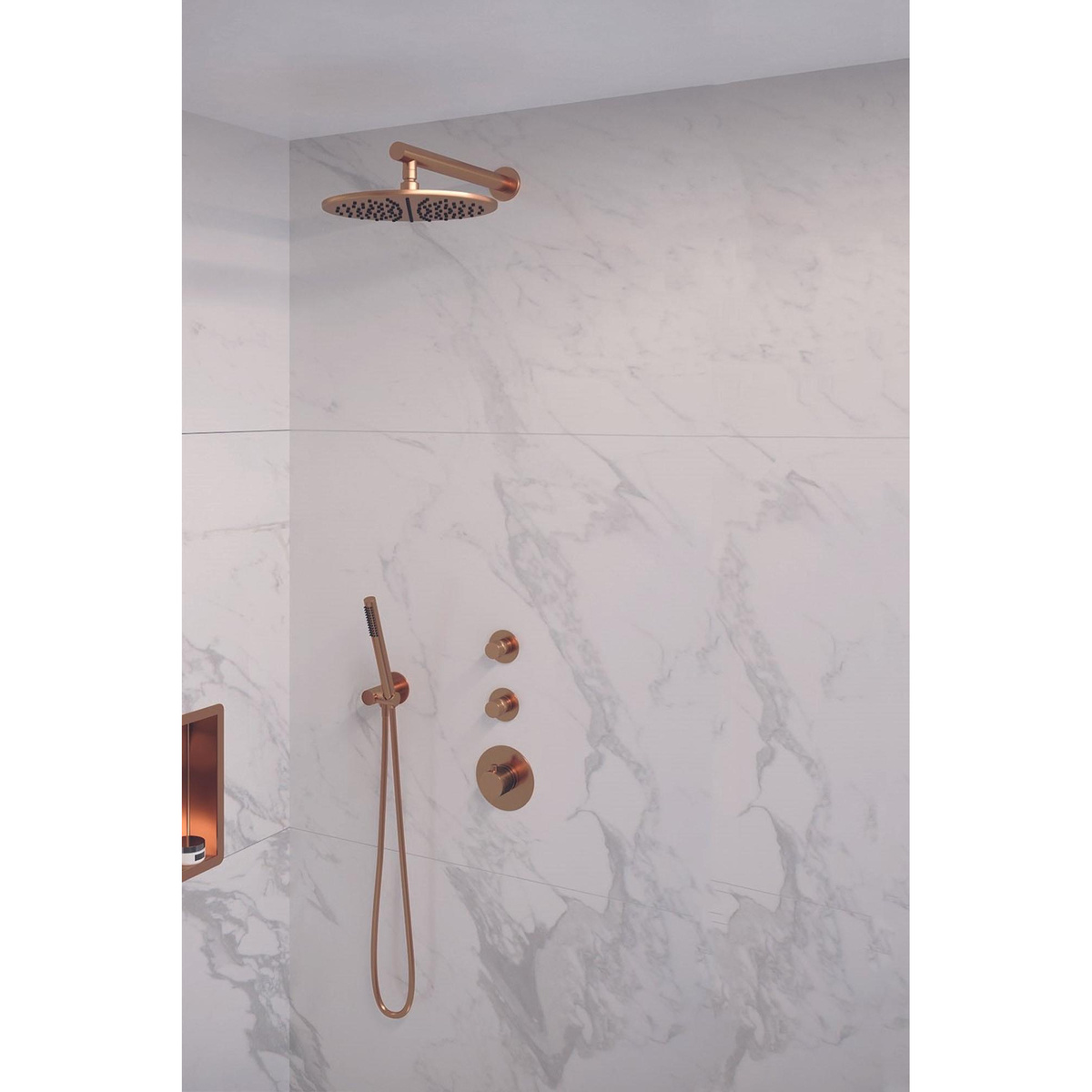 De inbouwthermostaat van deze set is eenvoudig te bedienen. Met de grote knop stel je moeiteloos de gewenste watertemperatuur in, terwijl de kleinere knoppen dienen voor het bedienen van de hoofd- en handdouche. Het minimalistische design van de regendouche past perfect bij elke badkamerstijl. Combineer het met koperkleurige badkameraccessoires voor een prachtig geheel. Dankzij de duurzame PVD-coating blijft de koperkleur er als nieuw uitzien.