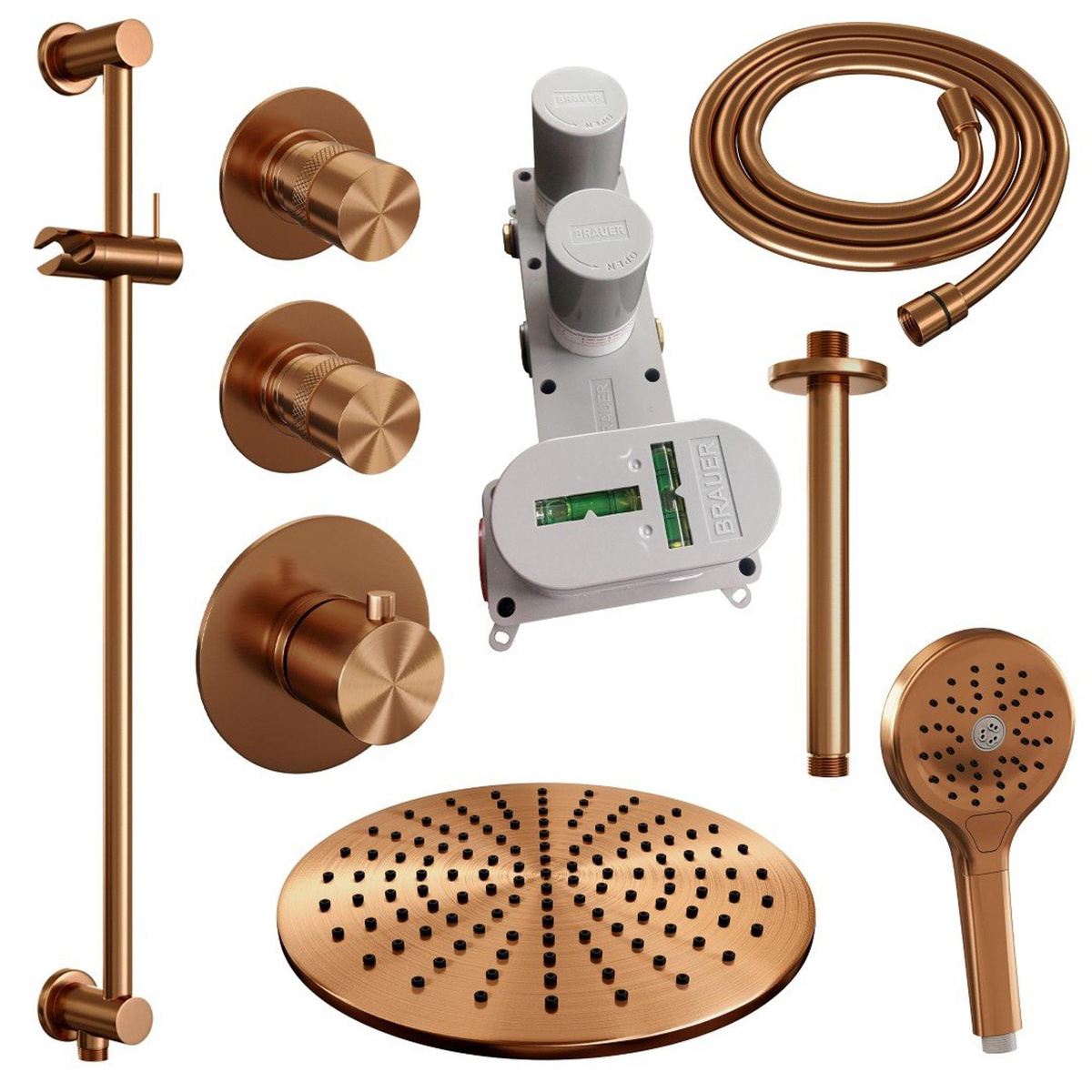 Brauer Copper Edition Regendoucheset inbouw - hoofddouche 30cm - plafondarm 20cm - 3 gladde knoppen - handdouche rond 3 standen - Geborsteld koper PVD