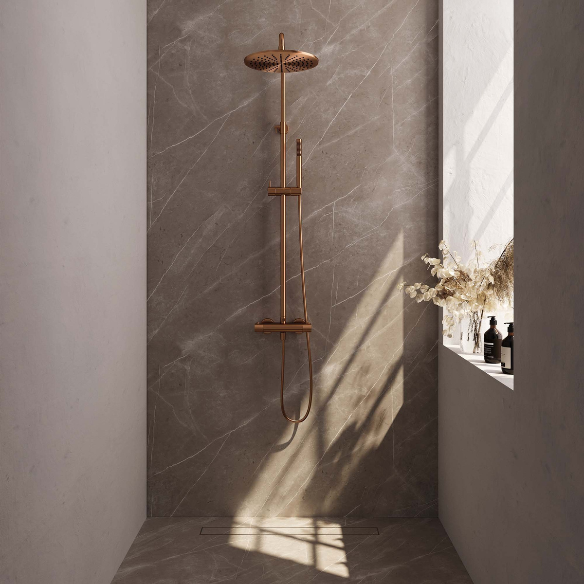 Offerte aanvraag voor Brauer Copper Edition Regendoucheset opbouw - hoofddouche 30cm - glijstang - handdouche staaf 1 stand - gladde knoppen - PVD - geborsteld koper | Geborsteld koper PVD | 30 cm | Staafhanddouche