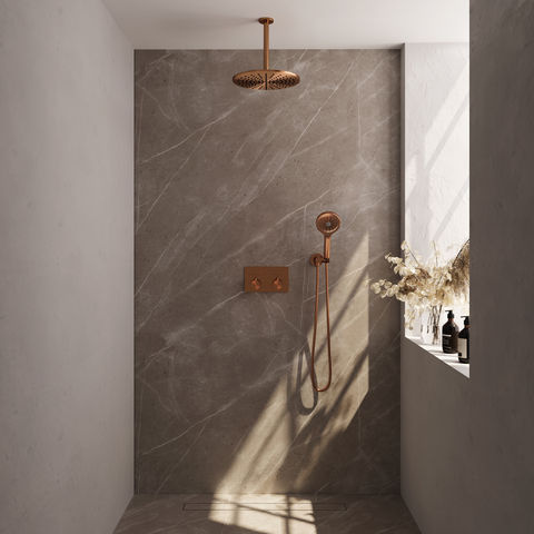 De set is gemaakt van duurzaam messing en afgewerkt met een PVD-coating in geborsteld koper. Deze coating zorgt ervoor dat de kleur mooi blijft en beter bestand is tegen krassen. De hoofddouche wordt aan het plafond gemonteerd en geeft een brede waterstraal. De handdouche heeft drie standen, zodat je zelf bepaalt welke straal je prettig vindt. Met de drukknoppen schakel je eenvoudig tussen de verschillende wateruitgangen of gebruik je ze tegelijk. Het inbouwdeel wordt meegeleverd, wat de montage overzichtelijker maakt. De set wordt geleverd zonder glijstang, dus de handdouche kun je niet ophangen aan een verstelbare stang.