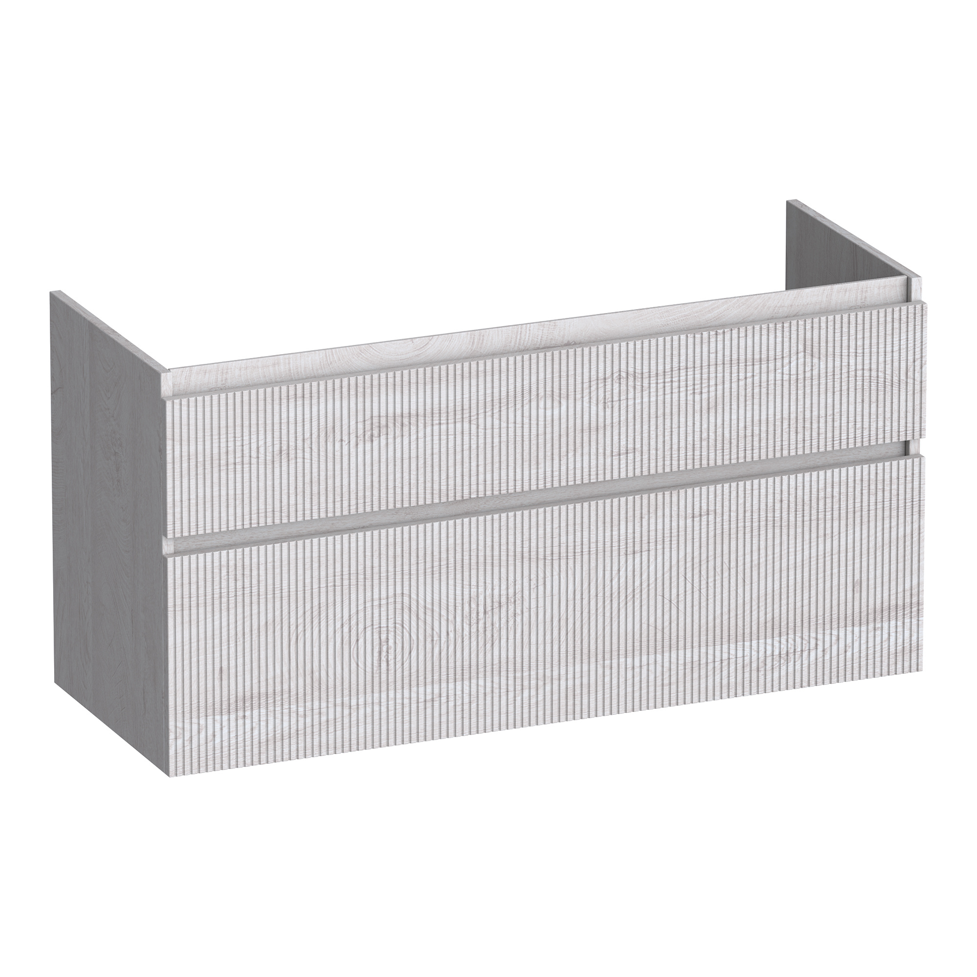Het karakteristieke ribbelpatroon op de fronten maakt van deze onderkast een blikvanger. De soft-close lades zorgen voor een geruisloze en soepele bediening, terwijl de wandmontage de vloer vrijhoudt voor een opgeruimde aanblik. Deze kast is een prachtige aanvulling in een badkamer die vraagt om stijl en functionaliteit.
