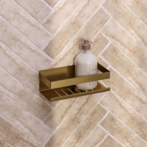 Het rek is uitgevoerd in een geborsteld goud PVD afwerking, wat betekent dat het een matte, gouden kleur heeft die niet snel zal vervagen. De PVD-coating zorgt ervoor dat de kleur langdurig mooi blijft, ook bij dagelijks gebruik in een vochtige omgeving zoals de douche. Het rek wordt geleverd met bevestigingsmateriaal, zodat je het direct kunt monteren. Let erop dat de bevestiging aan de zijkant zichtbaar is. Dit doucherek is niet geschikt voor plaatsing in een hoek, het is dus bedoeld voor een rechte wand. Naast deze gouden uitvoering is het rek ook verkrijgbaar in andere kleuren, zoals chroom, geborsteld gunmetal PVD, geborsteld koper PVD, geborsteld RVS PVD en mat zwart. Zo kun je het goed afstemmen op de rest van je badkamer.
