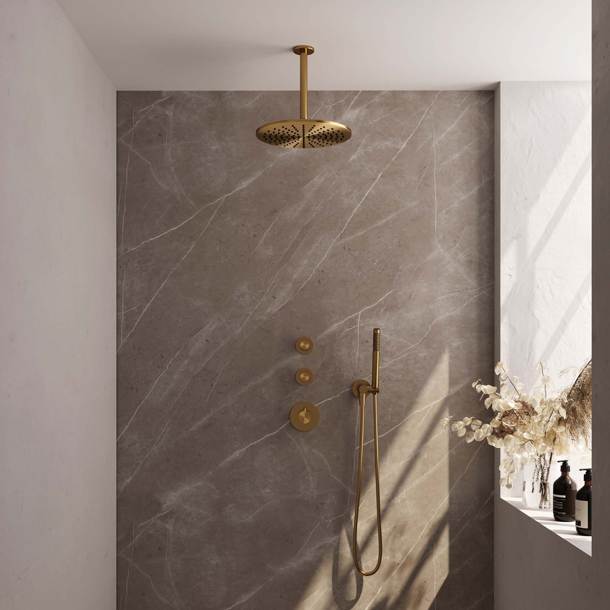 Naast de hoofddouche wordt de set geleverd met een handdouche in staafvorm met 1 stand, wat perfect is voor een veelzijdige douchesessie. De goud geborstelde PVD-coating geeft de set een luxueuze uitstraling en beschermt tegen krassen en slijtage.