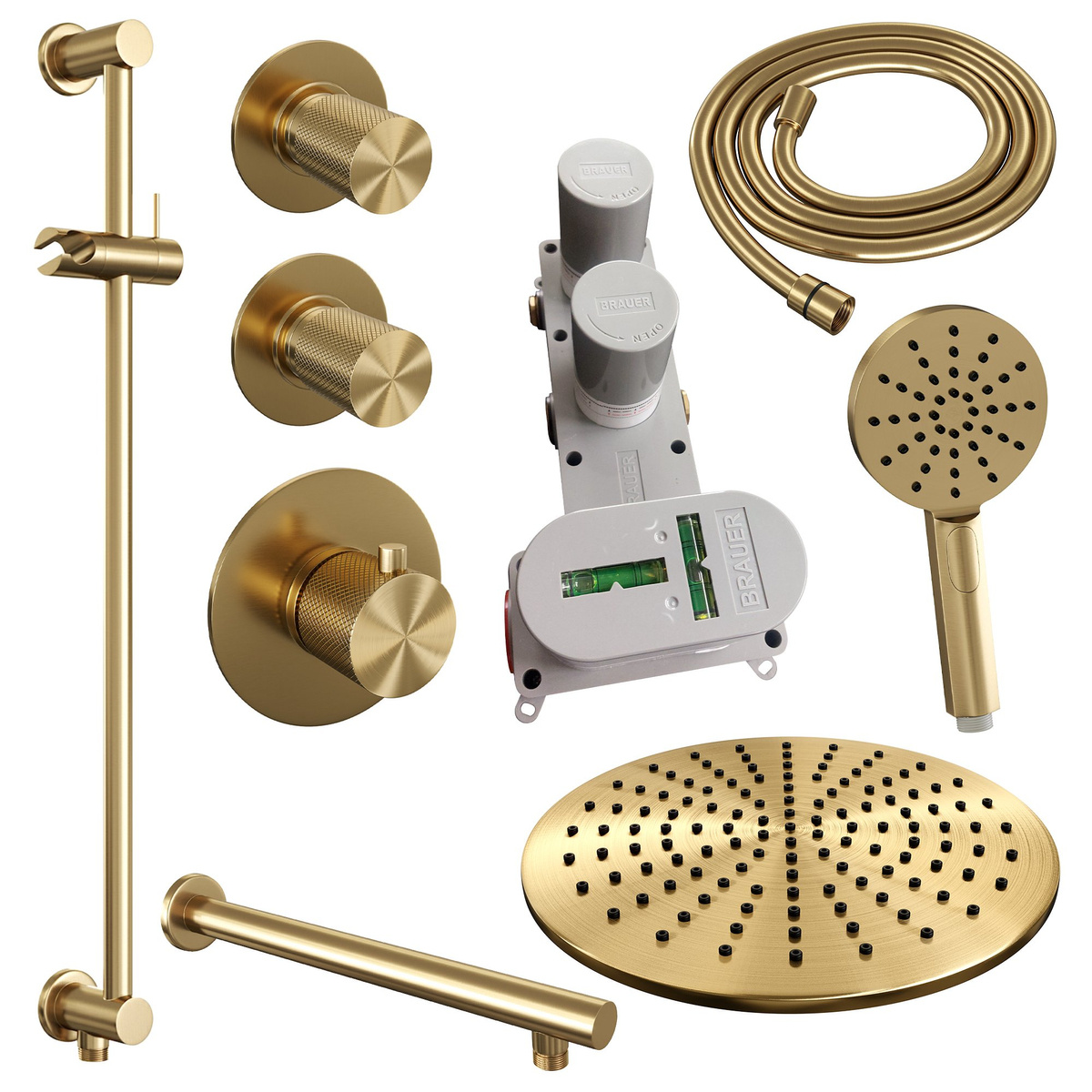 Brauer Gold Carving Regendoucheset inbouw - hoofddouche 30cm - 3 carving knoppen - rechte wandarm - glijstang - handdouche rond 3 standen - Geborsteld goud PVD