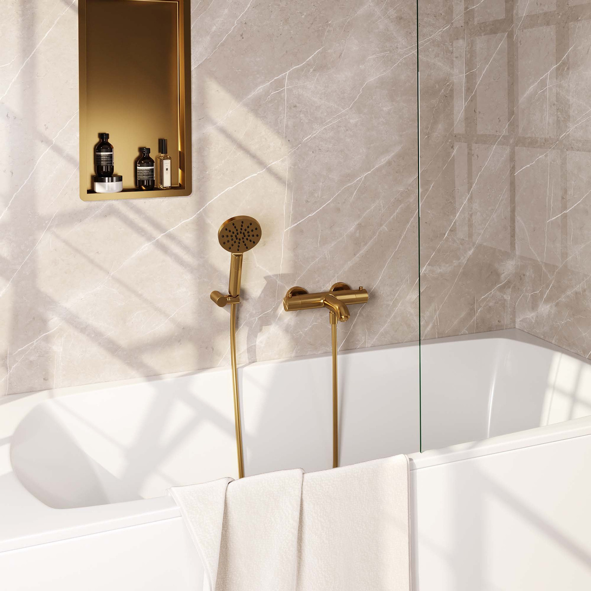 Niets werkt zo ontspannend als een warm bad na een lange dag. Daarbij heb je natuurlijk een goede kraan nodig om het bad te vullen. Deze luxe opbouw baddouche thermostaatkraan met handdouchehouder is een topper uit de Brauer Gold Edition serie. De thermostatische opbouw badkraan bevat een kraan, een baduitloop en een handdoucheset. In combinatie met andere goudkleurige elementen van Brauer creëer je een badkamer in jouw eigen stijl!