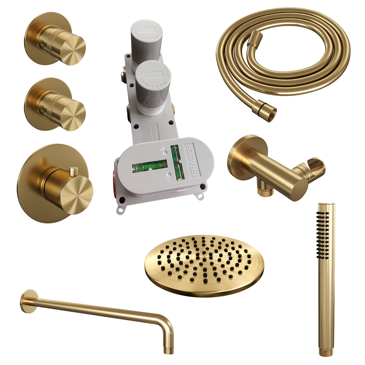 Ontdek de luxe en functionaliteit van de Brauer Gold Edition Regendouchesets inbouw. Deze complete doucheset bevat een thermostaatkraan, een 20 cm hoofddouche met wandarm, gladde knoppen en een handdouche in staafvorm met 1 stand. Geniet van een heerlijke en comfortabele douche-ervaring met deze hoogwaardige regendoucheset.