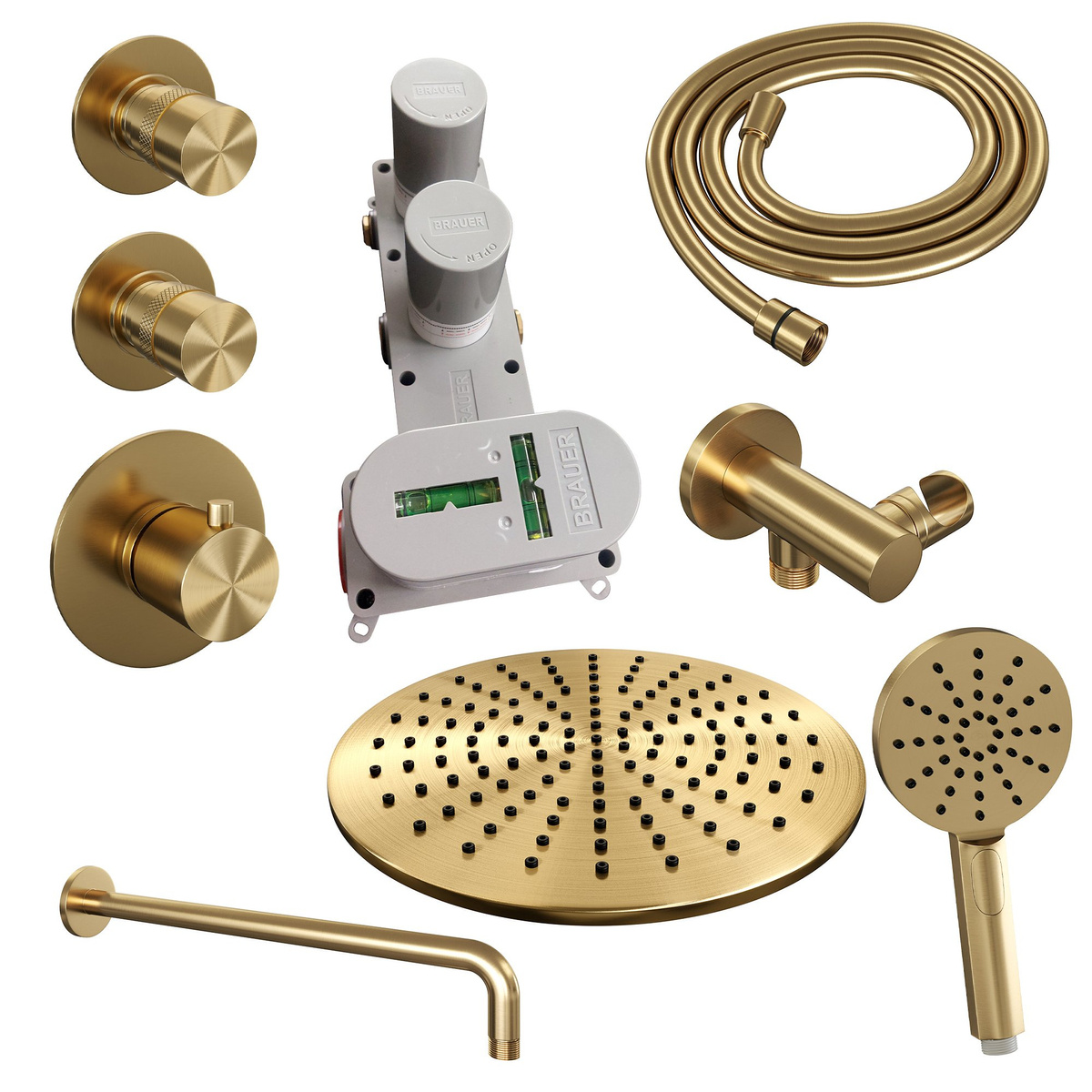Brauer Gold Edition Regendoucheset inbouw - hoofddouche 30cm - Wandarm - met inbouwdeel - Gladde knoppen - handdouche Rond 1 stand - Geborsteld goud PVD