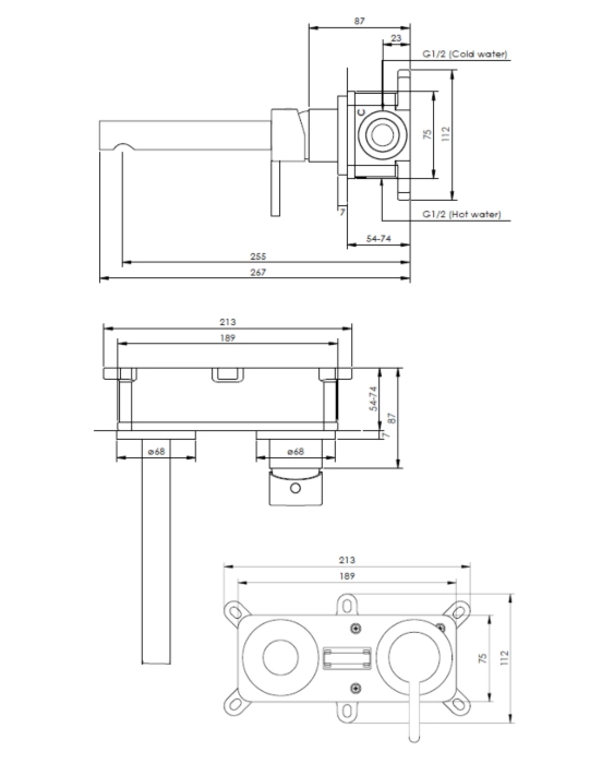 - Inbouwdiepte inbouwbox: 54-74 mm