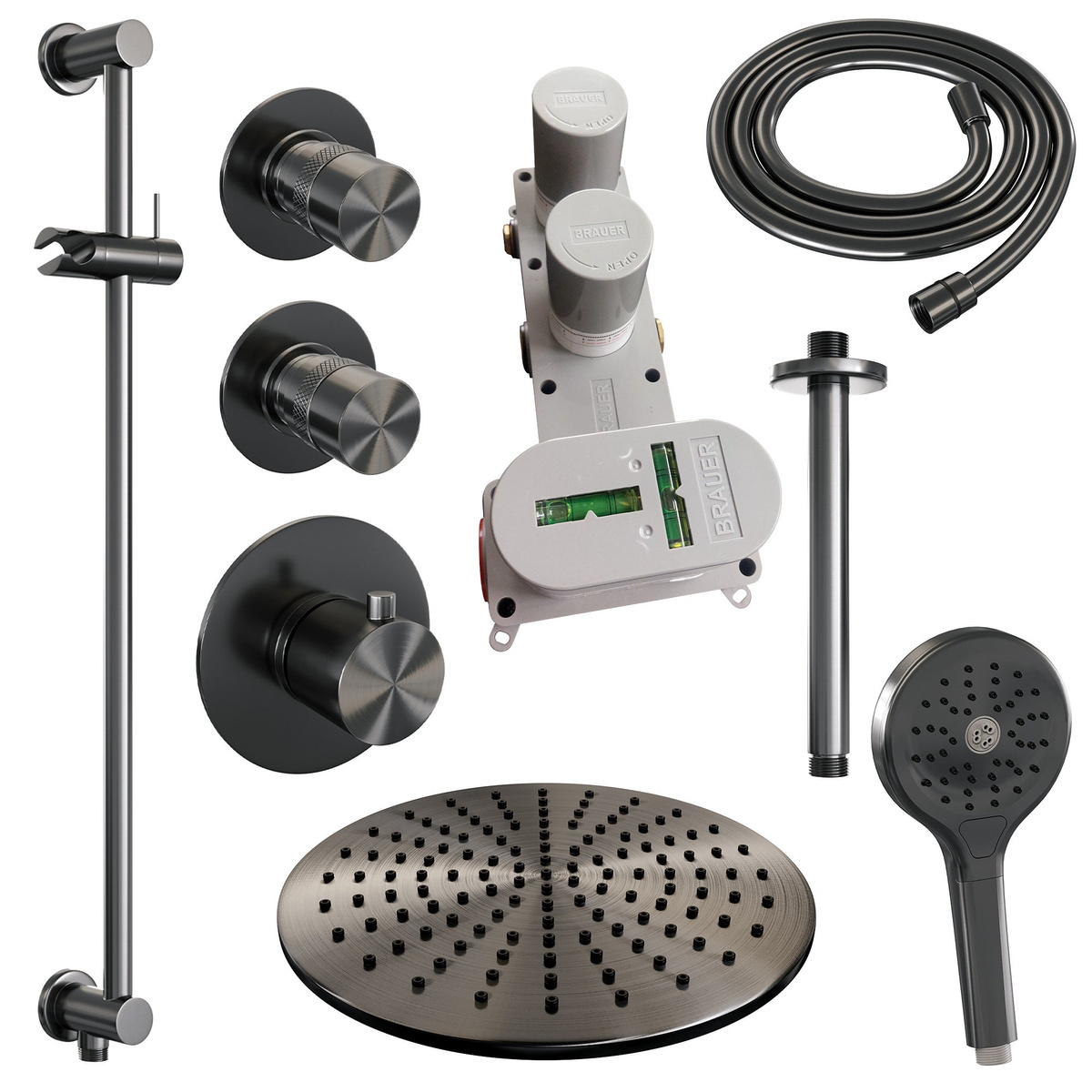 Brauer Gunmetal Edition Regendoucheset inbouw - hoofddouche 30cm - plafondarm 20cm - 3 gladde knoppen - handdouche rond 3 standen - Geborsteld gunmetal PVD