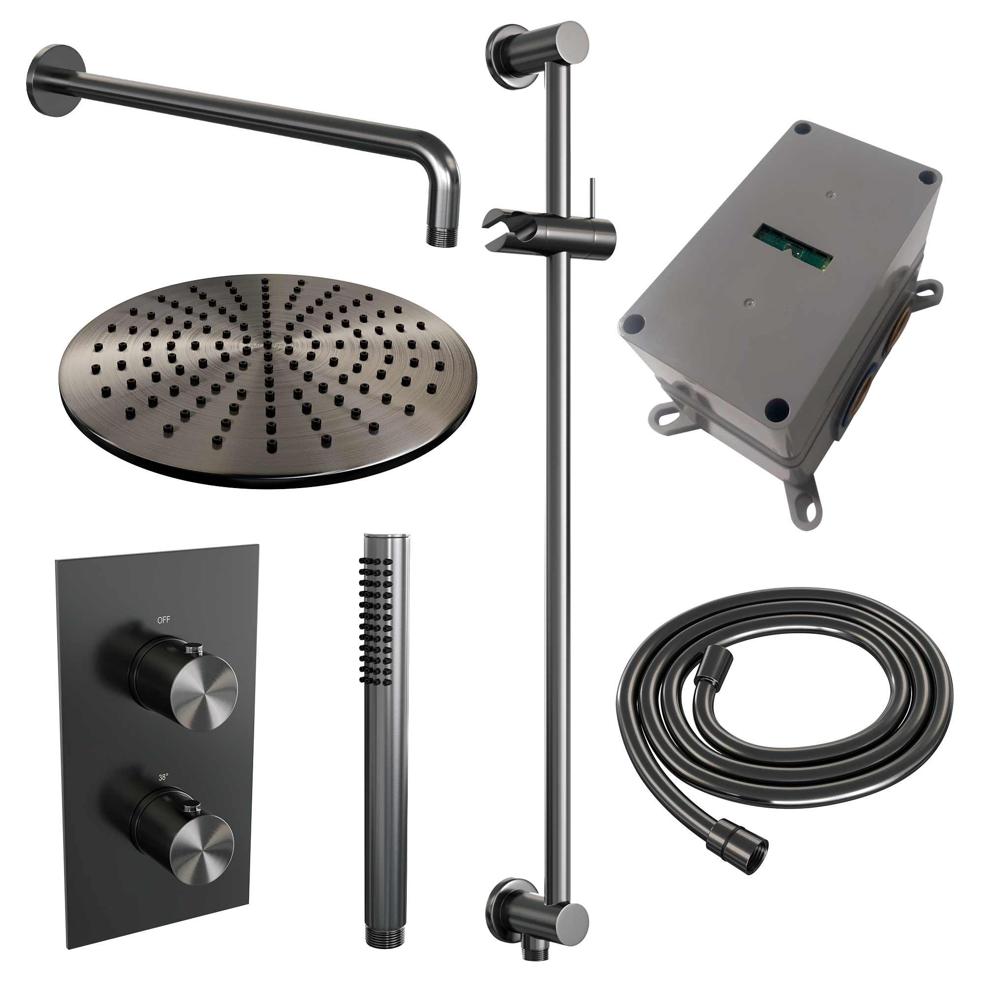 Brauer Gunmetal Edition thermostatische inbouw regendouche | Geborsteld gunmetal PVD | Staafhanddouche | 30 cm | Gebogen wandarm | Ja