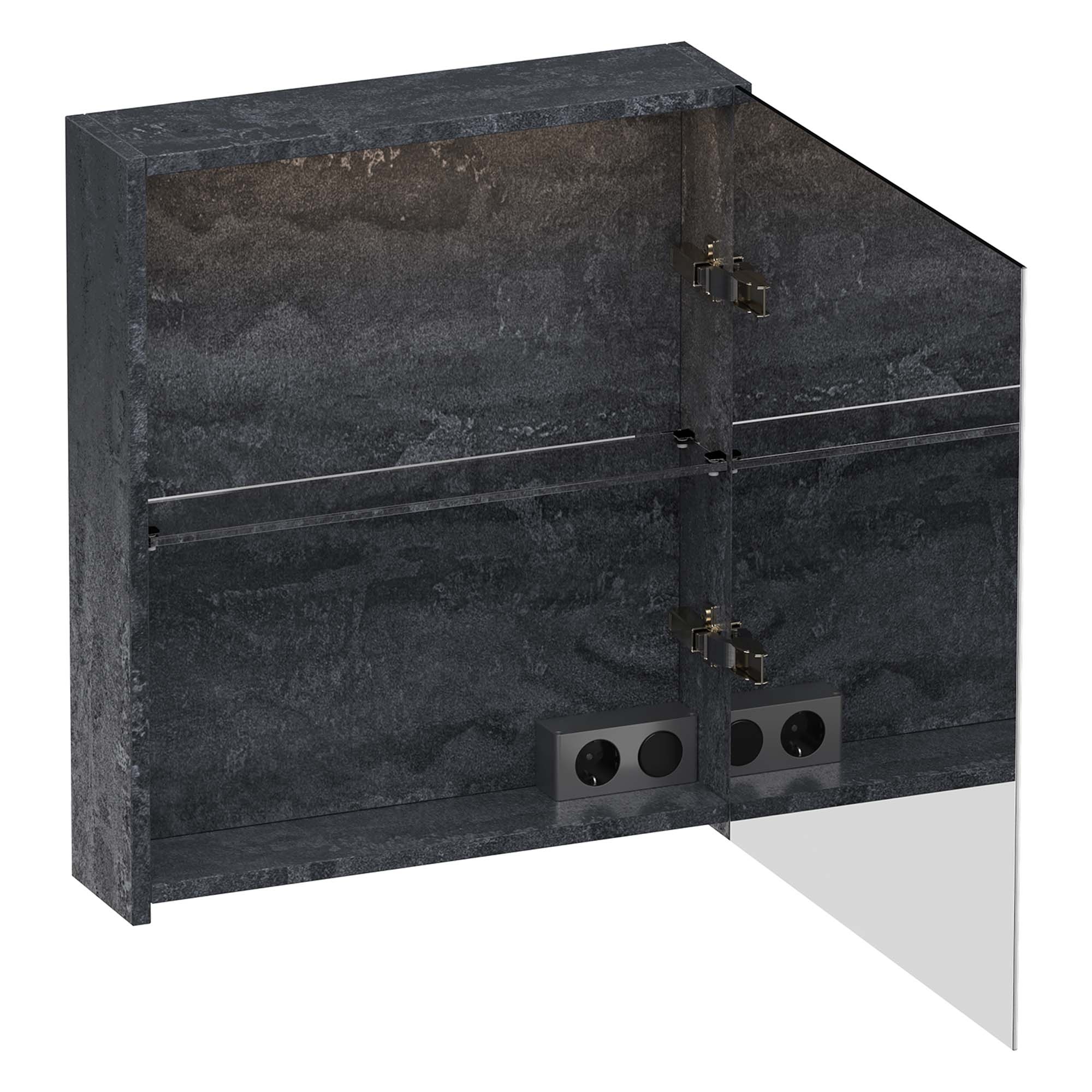 De spiegelkast heeft een slimme opzet met dubbelzijdige spiegeldeuren voor optimaal zicht, zowel binnen als buiten. Binnenin vind je een glazen legplank en een handig geïntegreerd stopcontact met schakelaar. De verlichting, subtiel geplaatst aan de binnen- en onderzijde, creëert een warme en stijlvolle sfeer.