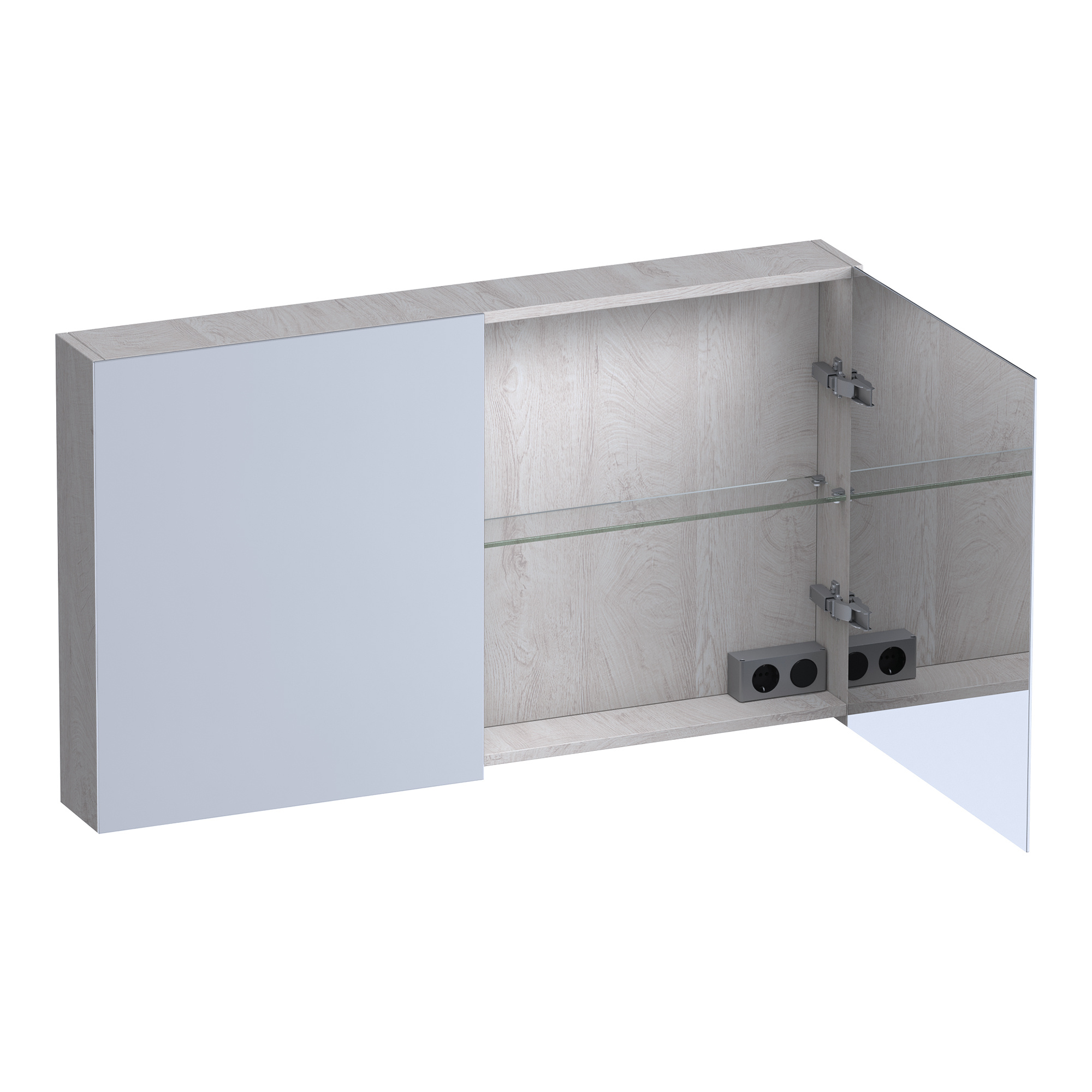De slimme LED-strips verlichten zowel de binnenkant als de ruimte onder de kast, wat zorgt voor een stijlvolle ambiance. Dubbelzijdige spiegeldeuren geven je het beste zicht aan beide kanten, ideaal voor een nauwkeurige verzorging. Een geïntegreerd stopcontact en schakelaar maken de kast nog praktischer in gebruik.