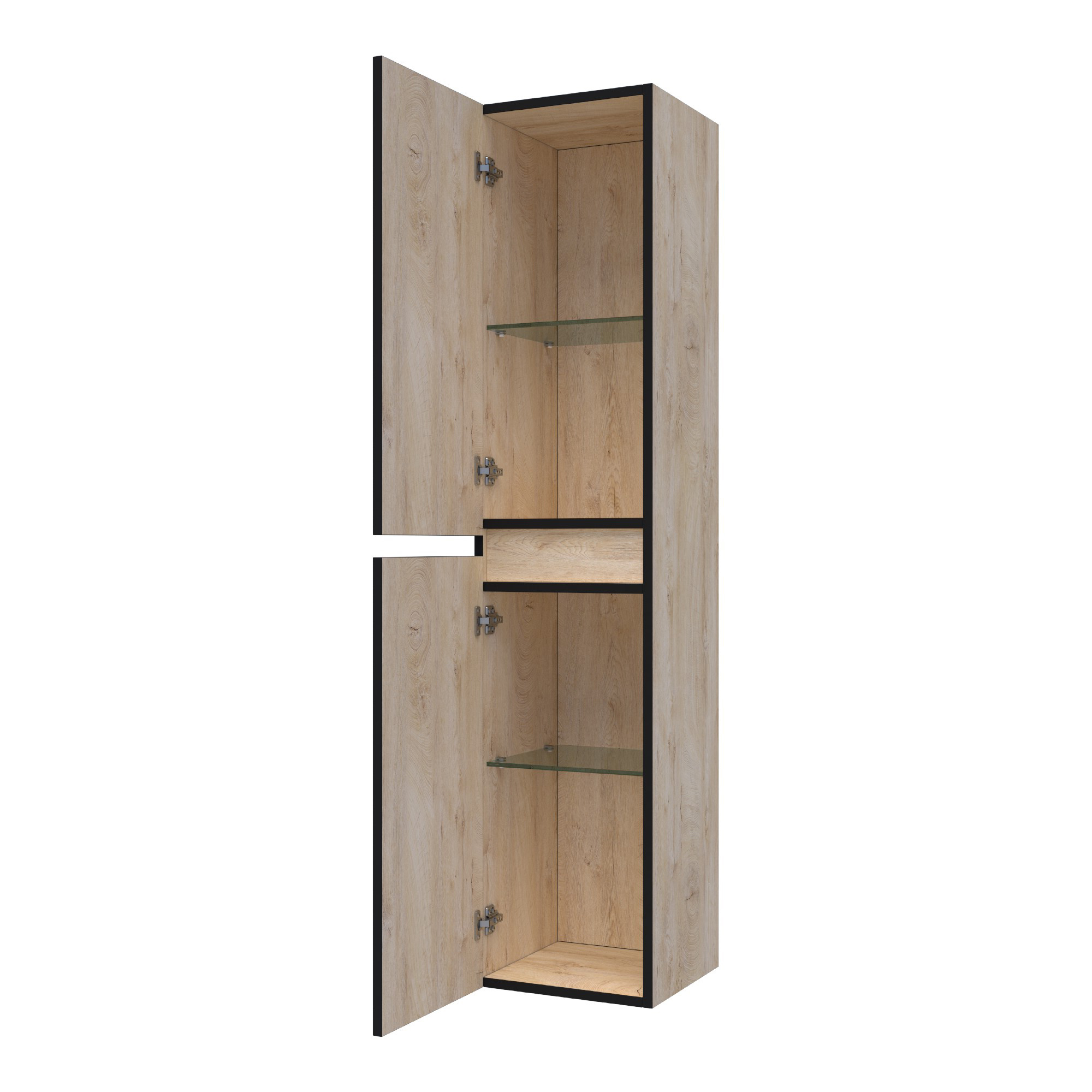 Deze hoge kast biedt een lichte, natuurlijke uitstraling die rust uitstraalt. Met zijn praktische indeling van vier vakken en twee glazen legplanken zorgt hij voor een efficiënte organisatie van je badkamerartikelen. De greeploze deuren sluiten geruisloos dankzij de softclosing technologie, wat bijdraagt aan een ontspannen sfeer.