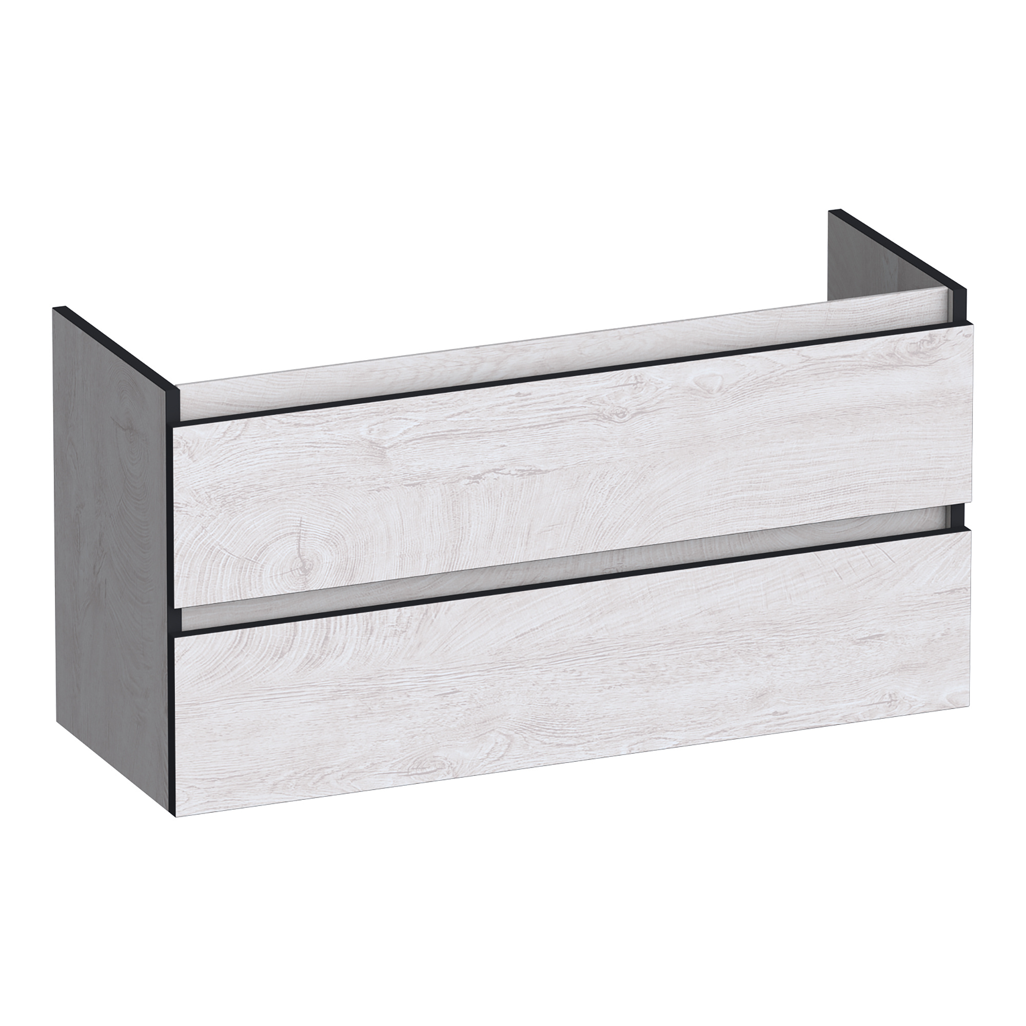 De zwarte rand rondom voegt een robuuste uitstraling toe aan het ontwerp, terwijl de symmetrische fronten zonder handgrepen een minimalistische look creëren. Ideaal voor compacte ruimtes, deze onderkast biedt opbergruimte zonder je badkamer te overweldigen.