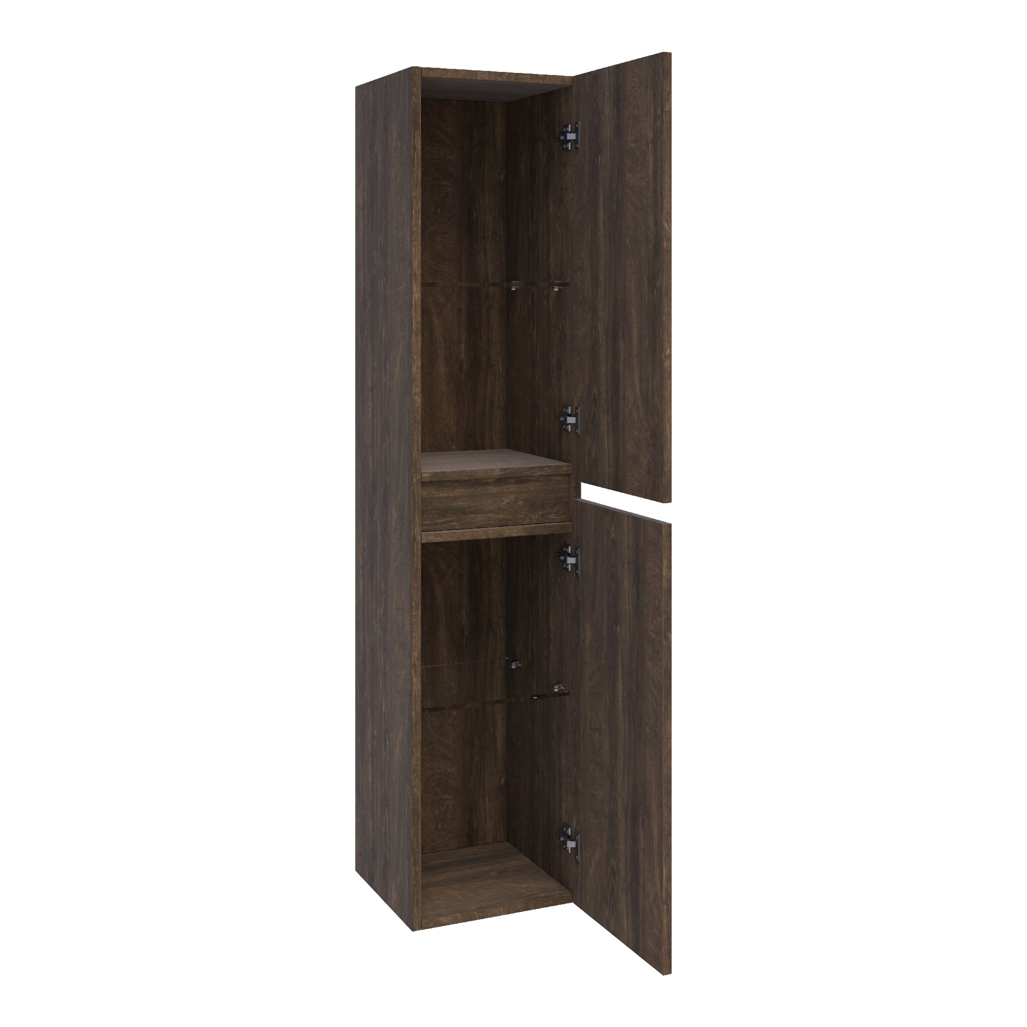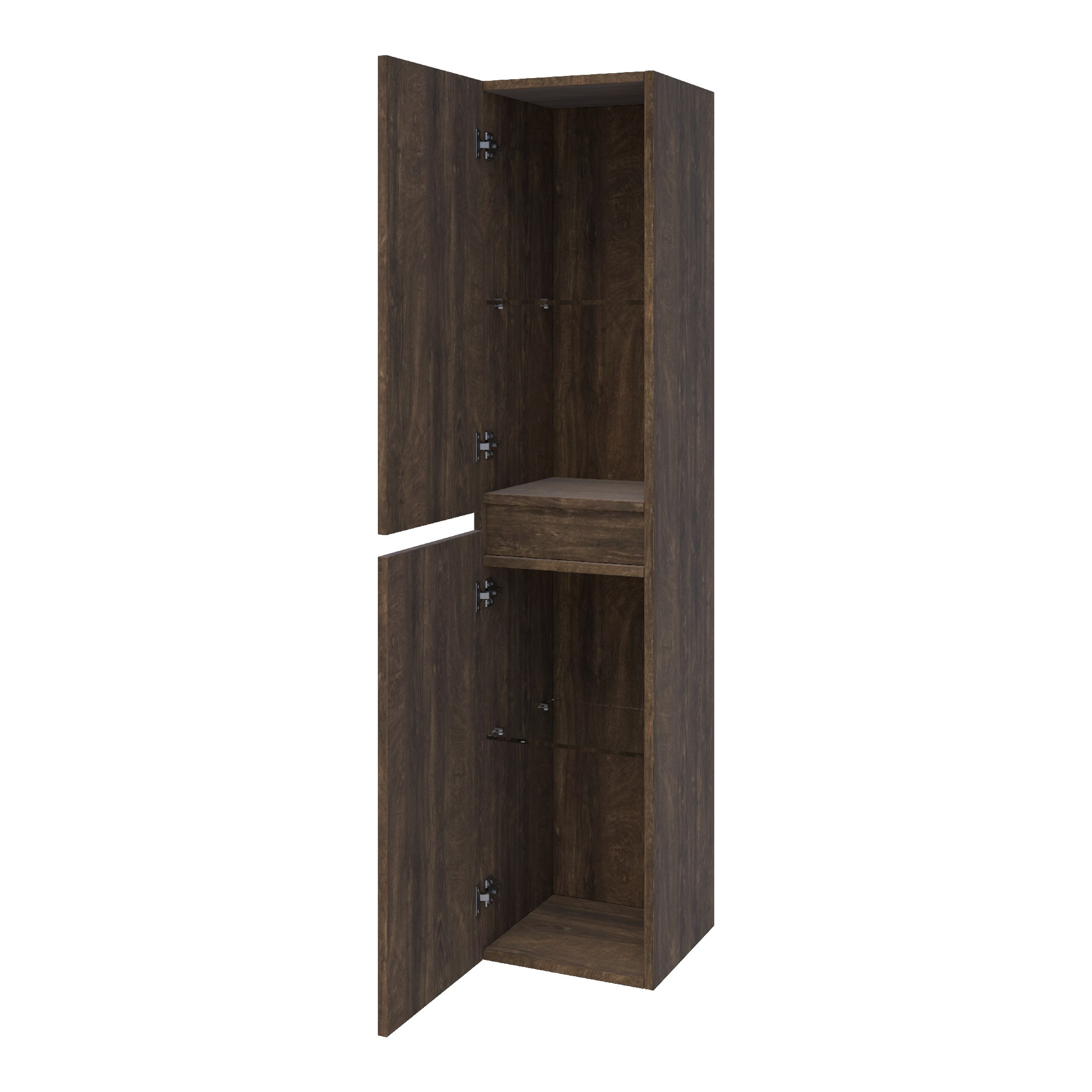 Deze hoge kast is voorzien van twee deuren met een softclosing systeem, wat zorgt voor een geruisloze ervaring. Met vier overzichtelijke vakken is alles binnen handbereik. Dankzij het slimme ontwerp kun je de kast zowel links als rechtsdraaiend monteren, zodat hij altijd past in jouw badkamerindeling.