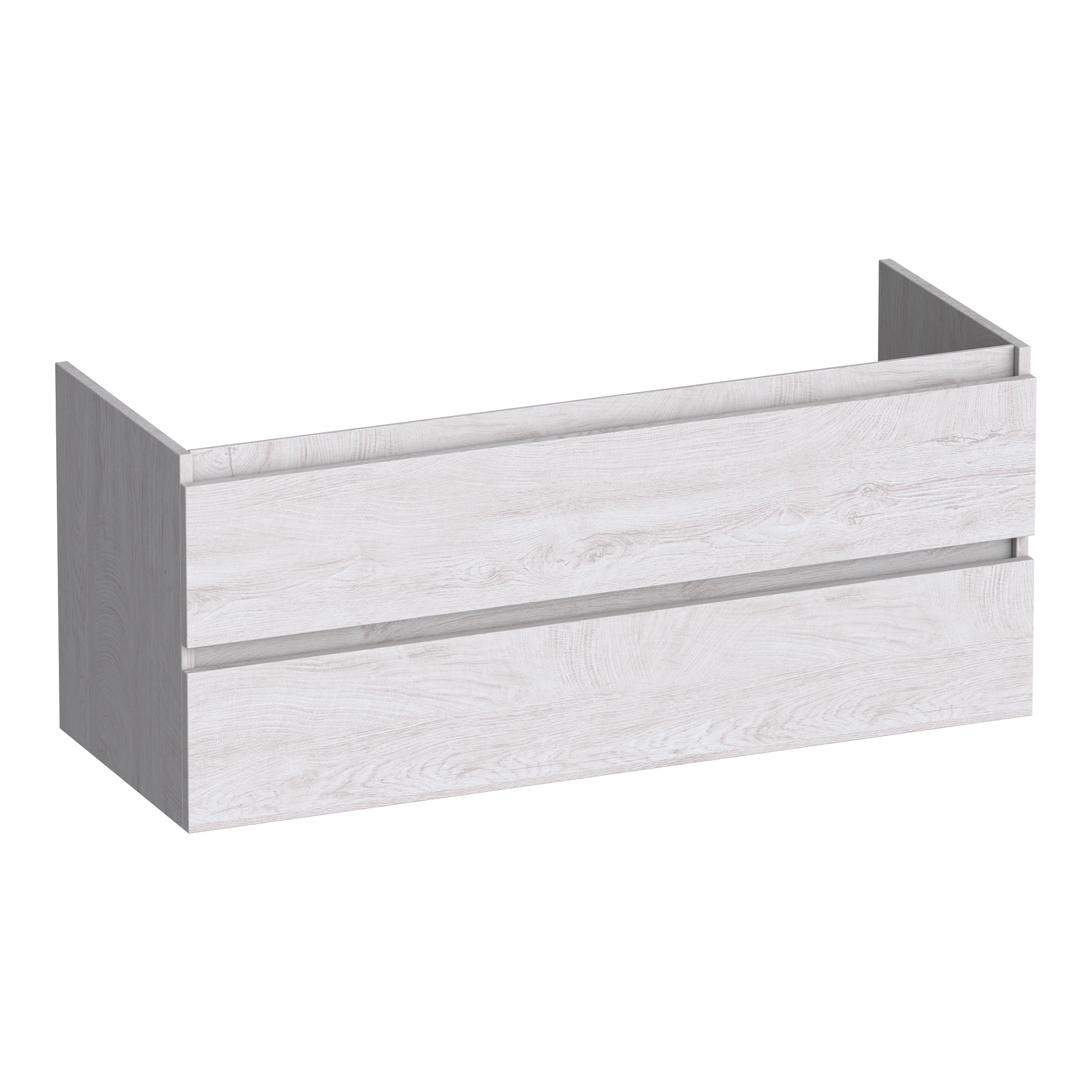 Deze onderkast combineert een greeploos design met opliggende ladefronten, wat zorgt voor een strakke uitstraling. De lades sluiten soepel en geruisloos, dankzij de soft-close functie. De solide wandmontage houdt de vloer vrij en oogt rustig.