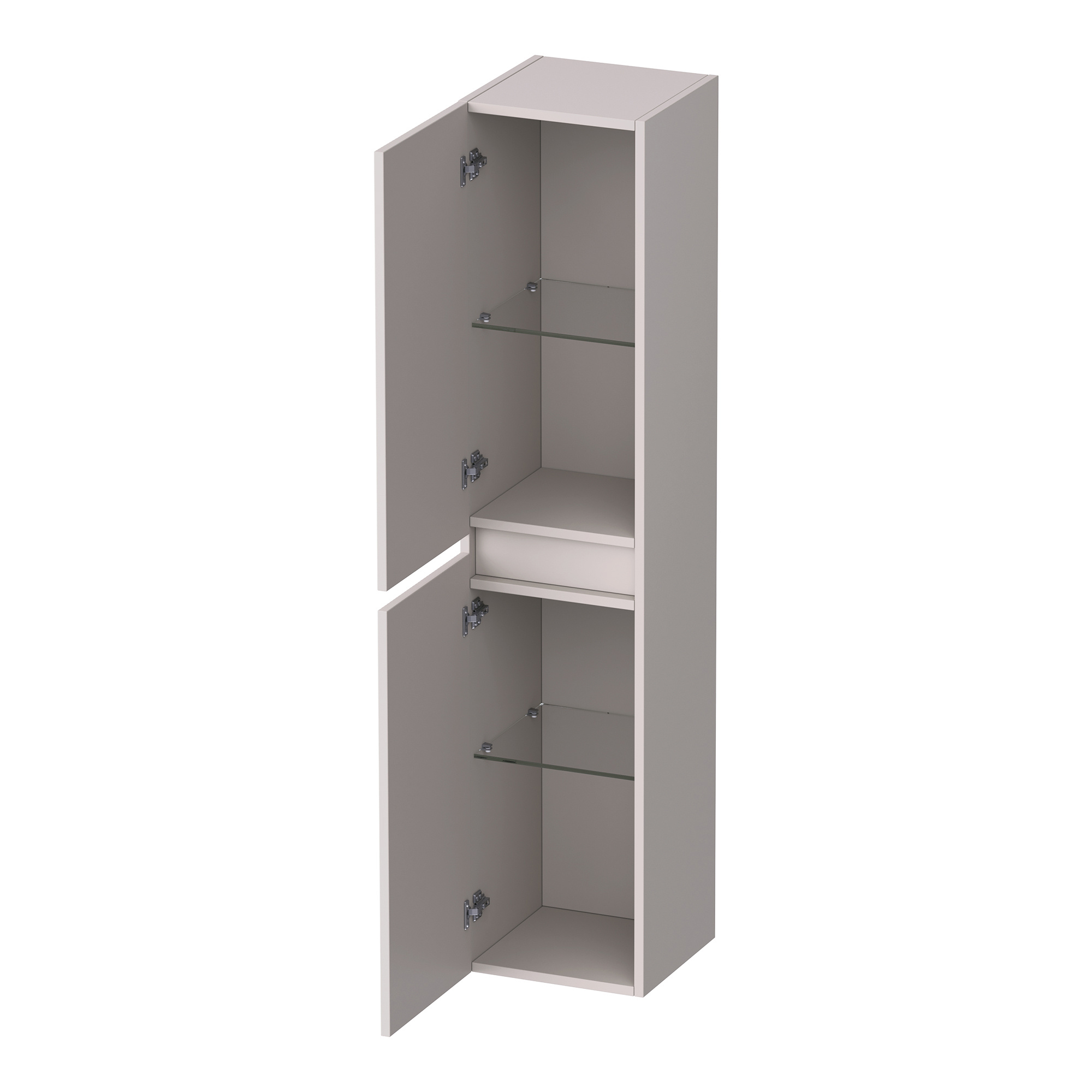Deze hoge kast heeft twee deuren die geruisloos sluiten, dankzij het softclosing mechanisme. De rechte verticale middengreep zorgt voor een moderne, greeploze look. Binnenin zijn er twee schappen, die de ruimte in vier vakken verdelen, ideaal voor een nette en georganiseerde opbergruimte.