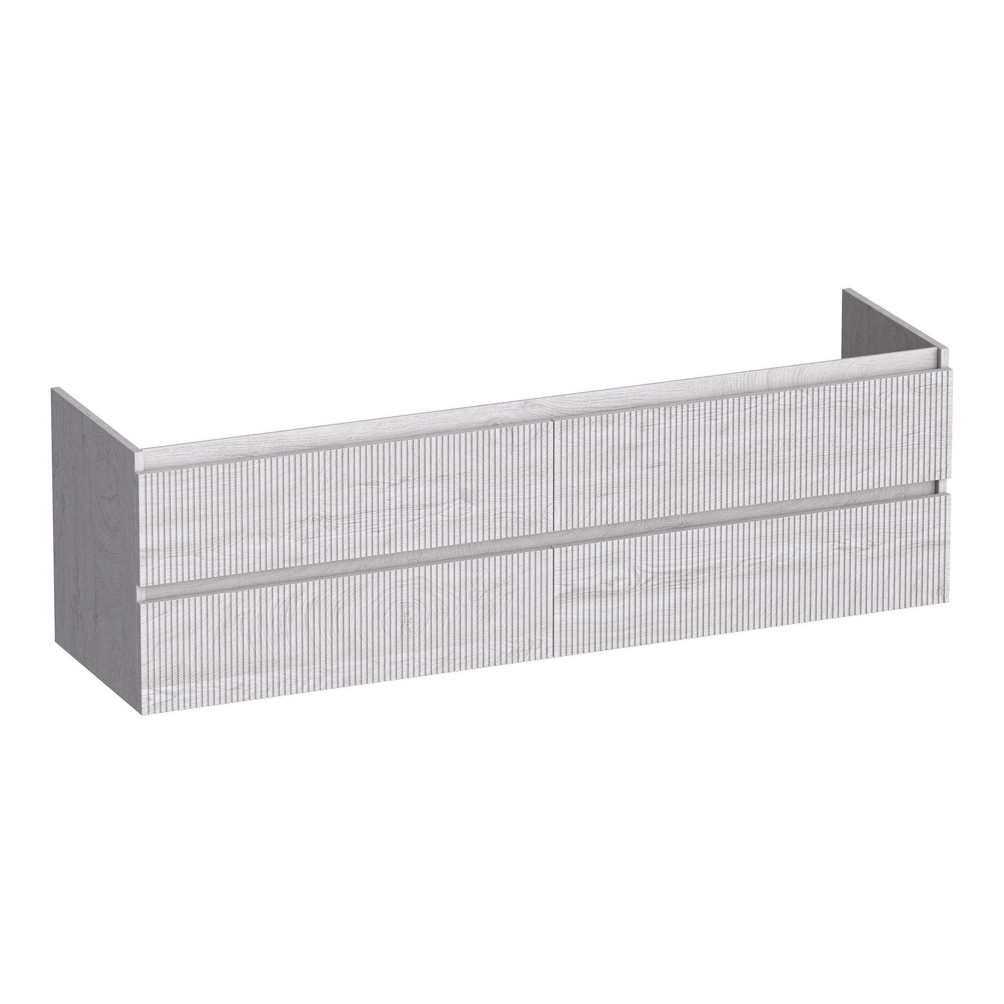 Met zijn strakke, greeploze fronten en symmetrische lijnen creëert deze onderkast een harmonieus geheel. De vier lades sluiten zacht dankzij het soft-close systeem, waardoor elke beweging bijna geruisloos verloopt. De verticale ribbelstructuur voegt een speels, maar subtiel element toe aan het geheel.