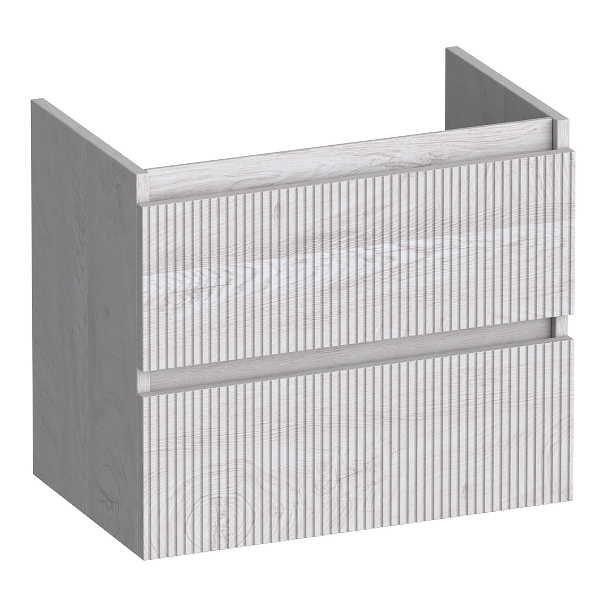 Met zijn unieke verticale ribbelstructuur creëert de kast een dynamisch effect. Het greeploze ontwerp met strakke lijnen maakt het tot een eigentijdse keuze. De geruisloze soft-close lades dragen bij aan een rustige sfeer.