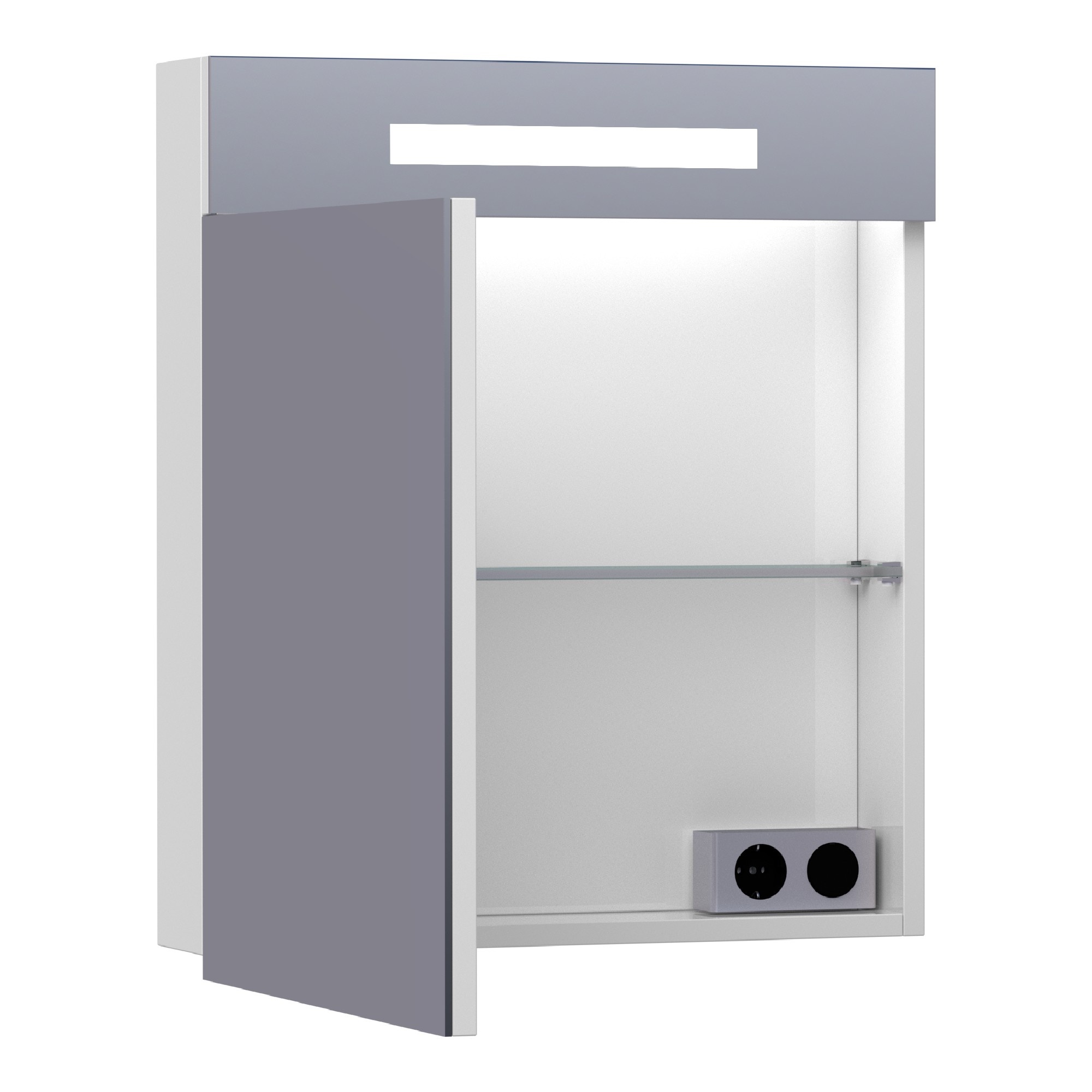 De enkelzijdige spiegeldeur biedt een spiegel aan de buitenzijde, terwijl binnenin een glazen legplank zorgt voor overzichtelijke opbergruimte. Een geïntegreerd stopcontact maakt het opladen van je scheerapparaat of föhn eenvoudig. De LED-verlichting aan de bovenkant zorgt voor helderheid wanneer je het nodig hebt.