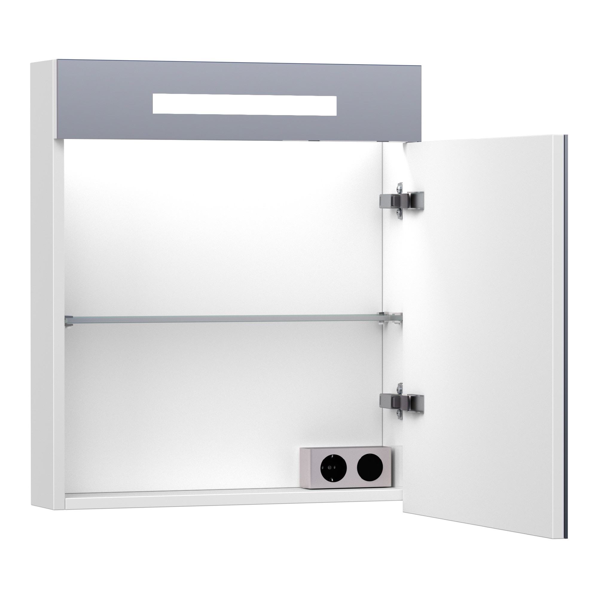 Deze spiegelkast combineert een enkele spiegeldeur met een handige glazen legplank voor al je benodigdheden. Een geïntegreerd stopcontact maakt het eenvoudig om je scheerapparaat of föhn aan te sluiten, terwijl de bovenliggende LED-verlichting zorgt voor helder zicht bij het opmaken of scheren.