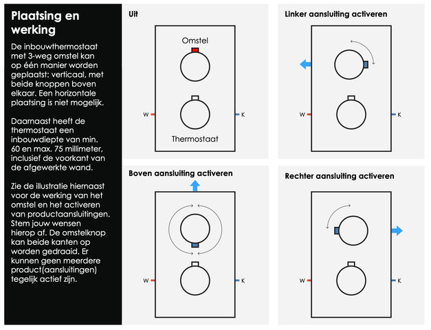 Deze inbouwthermostaat is handig als je een moderne, opgeruimde uitstraling wilt en meerdere waterpunten apart wilt bedienen. Het product is vooral geschikt voor doucheruimtes waar je verschillende functies (zoals een regendouche, handdouche of baduitloop) wilt combineren. Houd er rekening mee dat je de uitgangen niet tegelijk kunt gebruiken en dat handdouche en doucheslang niet standaard worden meegeleverd. Een inbouwoplossing vraagt om een goed doordacht plan en voldoende ruimte in de muur. Als je liever alles opbouwt of vaak meerdere waterpunten tegelijk gebruikt, is dit product minder geschikt.
