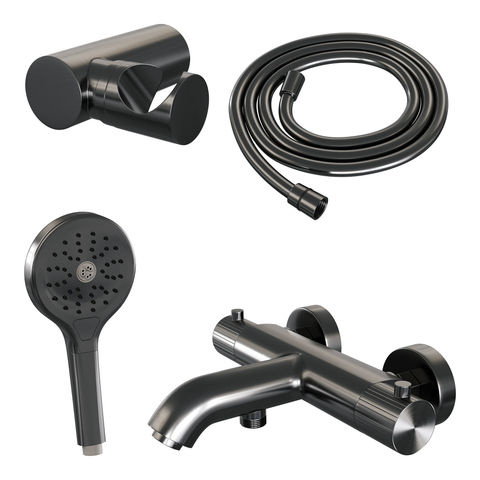 De set is gemaakt van messing, wat bekend staat om zijn stevigheid en betrouwbaarheid. De buitenkant heeft een PVD-coating in geborsteld gunmetal. Deze afwerking zorgt ervoor dat het oppervlak minder gevoelig is voor krassen en verkleuring. De thermostaatkraan regelt de temperatuur nauwkeurig en zorgt ervoor dat de buitenkant niet warmer wordt dan de ingestelde temperatuur. Dit verhoogt het comfort en de veiligheid tijdens gebruik. De set wordt compleet geleverd met een handdouche met drie standen en een flexibele doucheslang. Je kunt deze kraan ook kiezen in andere afwerkingen, zoals chroom, geborsteld goud PVD, geborsteld koper PVD, geborsteld RVS PVD en mat zwart.