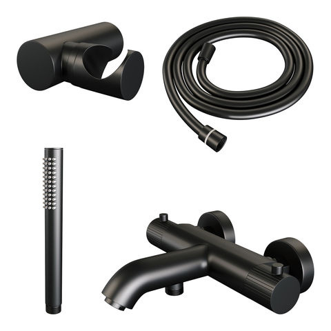 De set is gemaakt van messing, wat bekend staat om zijn degelijkheid. De afwerking is mat zwart, wat zorgt voor een rustige uitstraling. Let er wel op dat mat zwart wat gevoeliger is voor krassen dan sommige andere afwerkingen. Een tip is om de kraan eventueel met autowas te behandelen voor wat extra bescherming. De thermostaatkraan zorgt ervoor dat het water op een constante temperatuur blijft, wat prettig en veilig is in het gebruik. Handig is ook dat de buitenkant van de kraan niet warmer wordt dan de temperatuur die je instelt. Je krijgt bij deze set direct een handdouche en een doucheslang, zodat je alles bij de hand hebt. Mocht je liever een andere kleur willen, dan kun je kiezen uit chroom, geborsteld goud PVD, geborsteld gunmetal PVD, geborsteld koper PVD of geborsteld RVS PVD.
