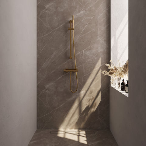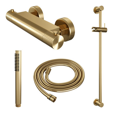 De set is uitgevoerd in geborsteld goud met PVD-coating. Deze afwerking zorgt voor een matte, gouden kleur die bestand is tegen krassen en verkleuring. Het gebruikte materiaal is messing, wat bekend staat om zijn duurzaamheid en kwaliteit. De thermostaatkraan zorgt ervoor dat het water op een constante temperatuur blijft, wat prettig is voor comfort en veiligheid. De buitenkant van de kraan wordt niet warmer dan de ingestelde temperatuur, wat het risico op verbranding vermindert. De set bevat een kantelbare houder voor de handdouche en een flexibele doucheslang, zodat je eenvoudig de juiste positie vindt. Deze doucheset is verkrijgbaar in meerdere afwerkingen: chroom, geborsteld goud PVD, geborsteld gunmetal PVD, geborsteld koper PVD, geborsteld RVS PVD en mat zwart.