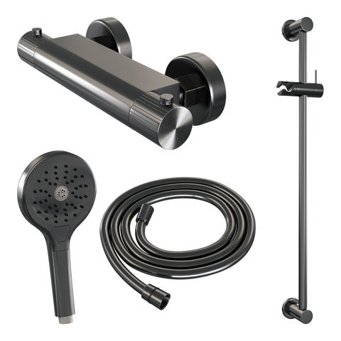 De set is gemaakt van messing, wat bekend staat om zijn degelijkheid. De afwerking is gunmetal geborsteld PVD, wat zorgt voor een matte, donkere uitstraling en extra bescherming tegen krassen. Je kunt deze set ook kiezen in andere kleuren, zoals chroom, geborsteld goud PVD, geborsteld koper PVD, geborsteld RVS PVD en mat zwart. De thermostaatkraan houdt het water op een constante temperatuur en de buitenkant wordt niet warmer dan de ingestelde temperatuur. Met de glijstang kun je de handdouche eenvoudig op de gewenste hoogte zetten. De handdouche heeft drie standen, die je met één druk op de knop aanpast. De doucheslang is flexibel, waardoor je veel bewegingsvrijheid hebt tijdens het douchen.