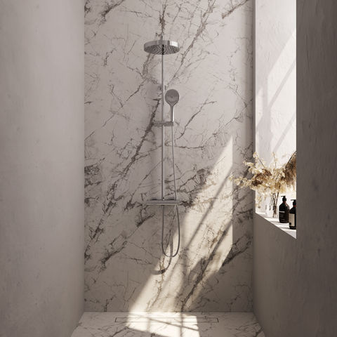 De set is uitgevoerd in chroom, een afwerking die neutraal oogt en in vrijwel elk badkamerinterieur past. Het materiaal van de set is messing, wat bekend staat om zijn degelijkheid en bestendigheid tegen vocht. De thermostatische kraan zorgt ervoor dat de buitenkant niet warmer wordt dan de ingestelde temperatuur, wat het gebruik extra veilig maakt. Je krijgt een hoofddouche van 25 cm doorsnee voor een brede waterstraal en een handdouche met drie verschillende straalsoorten, zodat je kunt kiezen wat prettig aanvoelt. De meegeleverde doucheslang is flexibel, wat handig is bij het schoonmaken of gericht afspoelen. Naast chroom is deze set verkrijgbaar in meerdere afwerkingen, zoals geborsteld goud, gunmetal, koper, RVS en mat zwart, zodat je kunt afstemmen op jouw smaak.