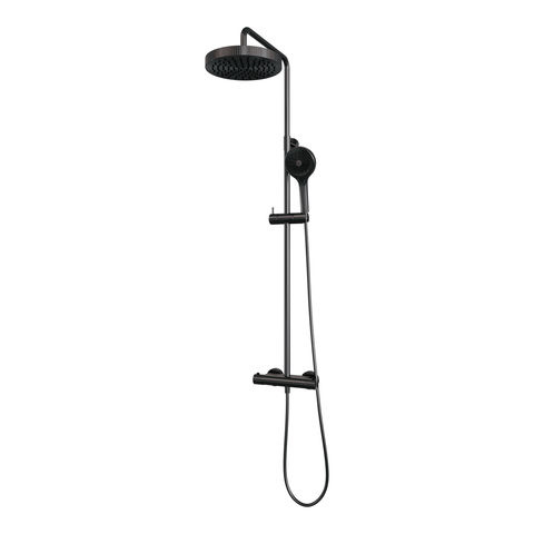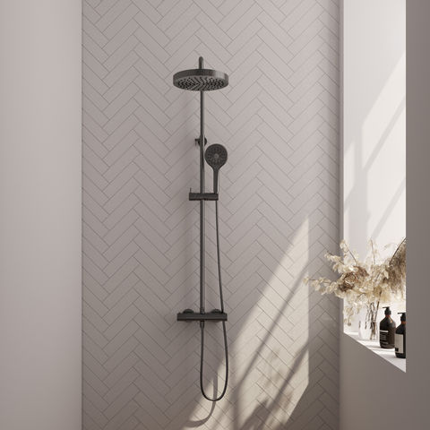 De set is vervaardigd uit duurzaam messing, wat bekend staat om zijn degelijkheid. De buitenkant is afgewerkt in gunmetal geborsteld PVD, een techniek die zorgt voor een sterke en krasvaste kleurlaag. Je krijgt een hoofddouche met een doorsnee van 25 cm, wat zorgt voor een brede waterstraal. De bijgeleverde handdouche biedt drie verschillende straalsoorten, zodat je kunt kiezen wat je prettig vindt. De flexibele doucheslang maakt het eenvoudig om de handdouche te gebruiken. Een praktisch detail is dat de buitenkant van de thermostaatkraan niet warmer wordt dan de ingestelde temperatuur. Deze doucheset is verkrijgbaar in meerdere afwerkingen, zoals chroom, geborsteld goud PVD, geborsteld koper PVD, geborsteld RVS PVD en mat zwart. Zo kun je de uitstraling afstemmen op jouw badkamer.