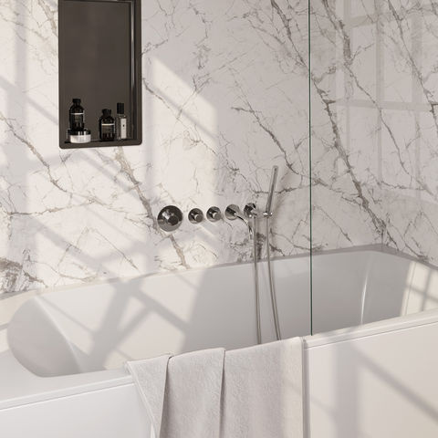 Deze set bestaat uit een inbouw badkraan met uitloop, een staaf handdouche, een doucheslang en een wandaansluitbocht. De afwerking is in chroom, wat bekend staat om zijn tijdloze uitstraling en het gemak in onderhoud. De thermostaat zorgt ervoor dat de temperatuur van het water stabiel blijft, wat prettig is als je niet steeds wilt bijstellen. Een belangrijk technisch voordeel is dat je twee wateruitgangen tegelijk kunt gebruiken: het bad vullen en de handdouche gebruiken. Het inbouwdeel wordt meegeleverd, wat het geheel compleet maakt voor montage. Deze set is verkrijgbaar in meerdere afwerkingen, zoals geborsteld goud PVD, geborsteld gunmetal PVD, geborsteld koper PVD, geborsteld RVS PVD en mat zwart, zodat je kunt kiezen wat het beste bij jouw badkamer past.