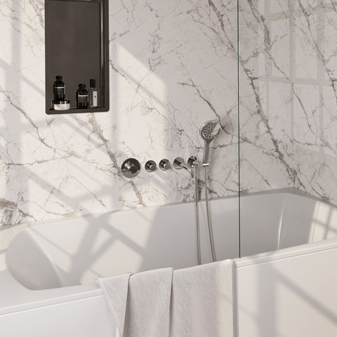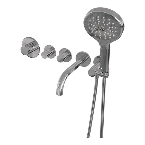 De badkraan is uitgevoerd in chroom, een afwerking die bekend staat om zijn tijdloze karakter en eenvoudige reiniging. Het product is voorzien van een thermostaat, waarmee je de gewenste temperatuur nauwkeurig instelt en behoudt tijdens het gebruik. De set bevat een inbouwdeel, een uitloop voor het vullen van het bad, een handdouche met drie standen, een doucheslang en een wandaansluitbocht. Je kunt twee wateruitgangen tegelijk gebruiken, bijvoorbeeld om het bad te vullen en tegelijk de handdouche te gebruiken. Naast chroom is deze set verkrijgbaar in meerdere afwerkingen: geborsteld goud PVD, geborsteld gunmetal PVD, geborsteld koper PVD, geborsteld RVS PVD en mat zwart. Dit geeft je keuzevrijheid om de kraan aan te passen aan jouw badkamerstijl.