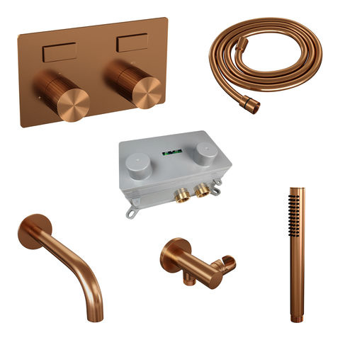 De kraan is uitgevoerd in een geborsteld koper PVD afwerking, die niet alleen zorgt voor een matte uitstraling, maar dankzij de PVD-coating ook langdurig mooi en krasvast blijft. De bediening werkt via drukknoppen, wat het wisselen tussen de baduitloop en handdouche eenvoudig en intuïtief maakt. Met de ingebouwde thermostaat blijft de watertemperatuur constant, wat prettig is als je graag zonder schommelingen in temperatuur wilt badderen. Je kunt bovendien twee wateruitgangen tegelijk gebruiken, bijvoorbeeld de uitloop en de handdouche. Het inbouwdeel wordt meegeleverd, wat het makkelijker maakt om alles in één keer te installeren. Deze set is verkrijgbaar in meerdere afwerkingen, waaronder chroom, geborsteld goud PVD, geborsteld gunmetal PVD, geborsteld RVS PVD en mat zwart.
