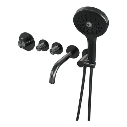 De set bestaat uit een inbouw badkraan, een uitloop, een 3-standen handdouche, een doucheslang en een wandaansluitbocht. De afwerking is geborsteld gunmetal PVD, wat zorgt voor een matte, donkere uitstraling en een krasbestendige laag. De set is ook verkrijgbaar in andere kleuropties, zoals chroom, geborsteld goud PVD, geborsteld koper PVD, geborsteld RVS PVD en mat zwart. Het inbouwdeel wordt meegeleverd, wat het plaatsen eenvoudiger maakt. Met de thermostaat stel je de gewenste temperatuur in en blijft het water constant warm. De handdouche heeft drie standen, zodat je zelf de straal kiest die je prettig vindt.