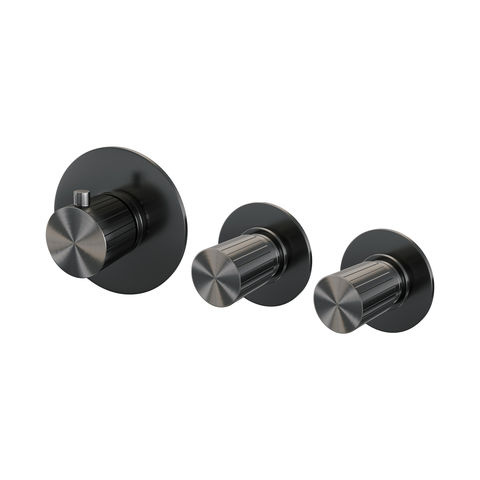 De afwerking van deze set is geborsteld gunmetal PVD. Dankzij de PVD-coating is het oppervlak extra krasbestendig en behoudt het langer zijn kleur. De thermostaat zorgt ervoor dat de watertemperatuur constant blijft, wat prettig is bij het vullen van het bad of tijdens het gebruik van de handdouche. Je kunt met deze set twee wateruitgangen gelijktijdig gebruiken, bijvoorbeeld het bad vullen en de handdouche gebruiken. De bediening is eenvoudig door de duidelijke knoppen en de meegeleverde handdouche heeft drie standen voor verschillende straalsoorten. Deze set is verkrijgbaar in meerdere afwerkingen: chroom, geborsteld goud PVD, geborsteld gunmetal PVD, geborsteld koper PVD, geborsteld RVS PVD en mat zwart.