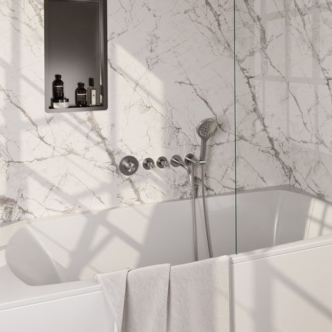 De kraan is uitgevoerd in een RVS-kleurig geborsteld PVD afwerking. PVD is een techniek waarbij een extra harde toplaag wordt aangebracht, wat het oppervlak beter bestand maakt tegen krassen en vlekken. De thermostaat zorgt ervoor dat het water op een constante temperatuur blijft, wat prettig is als je met meerdere mensen in huis bent of als je graag snel de juiste temperatuur wilt hebben. Je kunt twee wateruitgangen tegelijk gebruiken, bijvoorbeeld de uitloop en de handdouche. Het inbouwdeel wordt meegeleverd, wat het geheel compleet maakt. Deze badkraan is verkrijgbaar in meerdere afwerkingen, zoals chroom, geborsteld goud, gunmetal, koper, RVS en mat zwart. Zo kun je de kraan afstemmen op de rest van jouw badkamer.