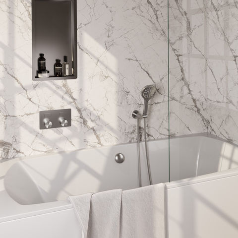 Deze Brauer Stripe thermostatische inbouw badkraan is bedoeld voor wie zijn bad graag op een moderne, praktische manier vult. Je bedient deze kraan eenvoudig via drukknoppen, waarmee je snel en intuïtief de gewenste functie kiest. Dit model is speciaal ontworpen voor inbouw en wordt geleverd als complete set, inclusief badvulcombinatie, een handdouche met drie standen, doucheslang en wandaansluitbocht. Dankzij de thermostaat kun je rekenen op een constante watertemperatuur tijdens het baden. Deze kraan is geschikt als je graag meerdere wateruitgangen tegelijk wilt gebruiken, bijvoorbeeld om het bad te vullen en de handdouche te gebruiken.