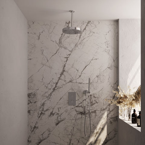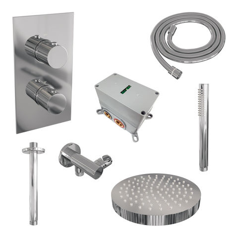 De set is uitgevoerd in chroom, een afwerking die neutraal oogt en makkelijk te combineren is met andere badkameraccessoires. Het materiaal van de set is duurzaam messing, wat bekend staat om zijn degelijkheid. De set bestaat uit een rechthoekig inbouwdeel, een 25 cm hoofddouche met plafondarm, een staaf handdouche, een flexibele doucheslang en een wandaansluitbocht. De thermostaat zorgt ervoor dat het water op een constante temperatuur blijft, wat het gebruik comfortabel en veilig maakt. Je bedient de verschillende functies via het 3-weg systeem, waarmee je kunt schakelen tussen hoofddouche en handdouche. Deze set is verkrijgbaar in verschillende afwerkingen, waaronder chroom, geborsteld goud PVD, geborsteld gunmetal PVD, geborsteld koper PVD, geborsteld RVS PVD en mat zwart.