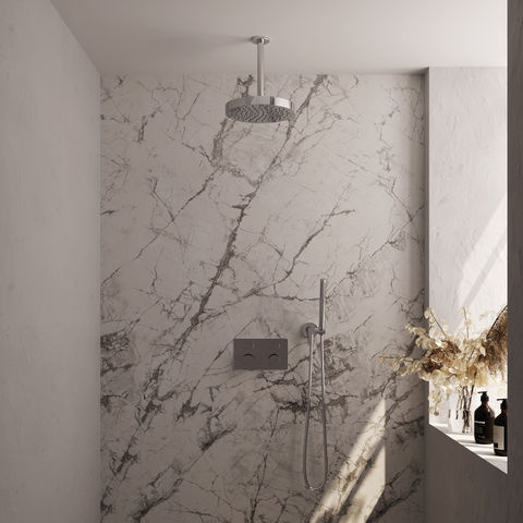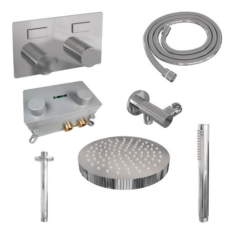 Deze doucheset bestaat uit een 25 cm hoofddouche met plafondarm, een staaf handdouche, een flexibele doucheslang en een wandaansluitbocht. De set is gemaakt van messing, wat bekend staat om zijn duurzaamheid en solide kwaliteit. De bediening werkt via drukknoppen, waarmee je eenvoudig en intuïtief schakelt tussen de verschillende wateruitgangen. De thermostaat zorgt ervoor dat de watertemperatuur constant blijft tijdens het douchen. Het inbouwdeel wordt meegeleverd, wat de montage overzichtelijk maakt. Let op dat deze set geen verschillende straalsoorten biedt en er wordt geen glijstang meegeleverd voor de handdouche. Naast chroom is deze set verkrijgbaar in meerdere afwerkingen, zoals geborsteld goud PVD, geborsteld gunmetal PVD, geborsteld koper PVD, geborsteld RVS PVD en mat zwart.