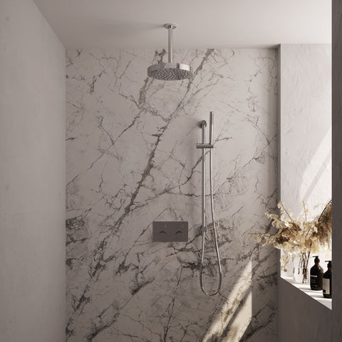 Deze doucheset is uitgevoerd in chroom, een afwerking die tijdloos is en makkelijk te combineren met andere badkamerproducten. Het materiaal is messing, wat bekend staat om zijn stevigheid en duurzaamheid. De set bestaat uit een hoofddouche van 25 cm, een plafondarm, een staafhanddouche, een flexibele doucheslang en een geïntegreerde glijstang. De bediening werkt via drukknoppen, wat intuïtief en eenvoudig is. De set heeft een geïntegreerde thermostaat, zodat de temperatuur stabiel blijft. Je kunt deze doucheset ook in andere kleuren bestellen, zoals geborsteld goud PVD, geborsteld gunmetal PVD, geborsteld koper PVD, geborsteld RVS PVD en mat zwart. Houd er rekening mee dat deze set één straalsoort heeft.