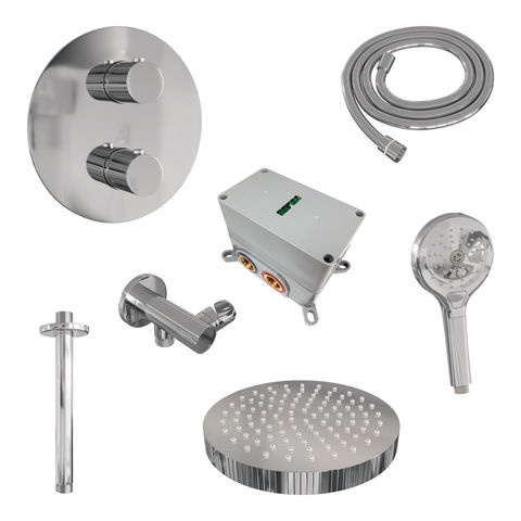 Brauer Stripe thermostatische inbouw regendouche 3-weg rond SET 42 met 25 cm douchekop en plafondarm en 3-standen handdouche en doucheslang en wandaansluitbocht chroom | Chroom | Nee | Plafondbuis | 3-standen handdouche