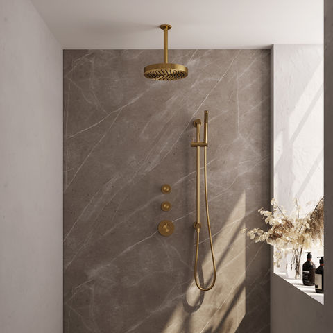 De set is uitgevoerd in geborsteld goud en afgewerkt met een PVD-coating. Dit zorgt ervoor dat de kleur mooi blijft, ook bij intensief gebruik. Het gebruikte materiaal is kwalitatief messing, wat bekend staat om zijn duurzaamheid. De thermostaat zorgt ervoor dat de watertemperatuur constant blijft, wat prettig is voor het comfort en de veiligheid. Je kunt zowel de hoofddouche als de handdouche gelijktijdig gebruiken. De geïntegreerde glijstang maakt het makkelijk om de handdouche op de gewenste hoogte te zetten. Deze doucheset is verkrijgbaar in meerdere afwerkingen, zoals chroom, geborsteld gunmetal, geborsteld koper, geborsteld RVS en mat zwart. Zo kun je de set goed afstemmen op de stijl van jouw badkamer.