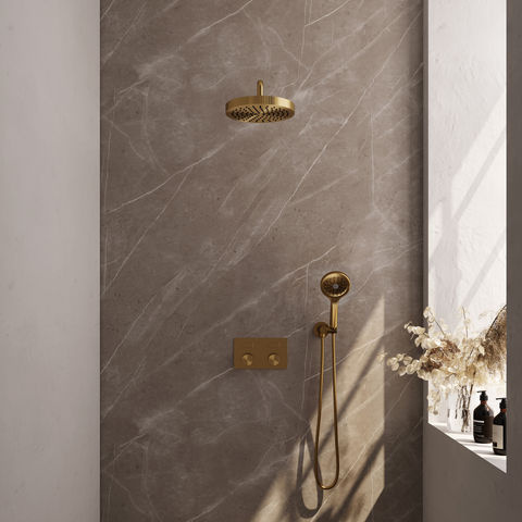 De set is uitgevoerd in geborsteld goud PVD. Deze PVD-coating zorgt ervoor dat de kleur mooi blijft en dat het oppervlak mat is, wat vingerafdrukken minder zichtbaar maakt. Het materiaal is massief messing, wat bekend staat om zijn degelijkheid. Je bedient de douche via elegante drukknoppen, waarmee je soepel schakelt tussen de hoofddouche en de handdouche. De handdouche heeft drie verschillende straalsoorten, zodat je kunt kiezen wat je prettig vindt. De thermostaat zorgt ervoor dat de temperatuur constant blijft tijdens het douchen. Het inbouwdeel wordt meegeleverd, wat het installeren eenvoudiger maakt. Deze set is verkrijgbaar in meerdere afwerkingen, zoals chroom, geborsteld gunmetal, koper, RVS en mat zwart.