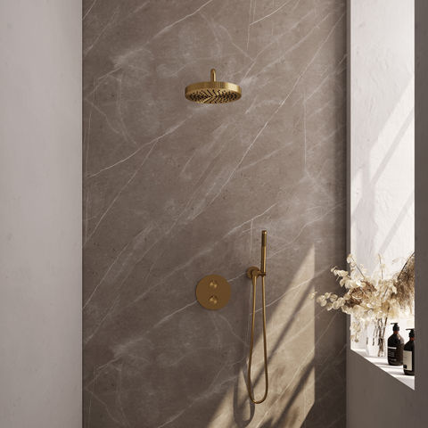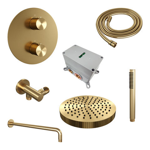 De set is uitgevoerd in geborsteld goud PVD, wat zorgt voor een matte afwerking met een warme, gouden kleur. De PVD-coating draagt bij aan het behoud van de kleur. Het geheel is gemaakt van messing, een materiaal dat bekend staat om zijn kwaliteit. De set bestaat uit een hoofddouche en een handdouche, beide direct klaar voor gebruik dankzij de meegeleverde doucheslang en wandaansluitbocht. De thermostaatkraan helpt je om de temperatuur constant te houden. Je kunt deze set ook in andere kleuren kiezen, zoals chroom, geborsteld gunmetal PVD, geborsteld koper PVD, geborsteld RVS PVD of mat zwart. Houd er rekening mee dat deze set niet beschikt over verschillende straalsoorten en dat je de handdouche niet aan een glijstang kunt hangen.