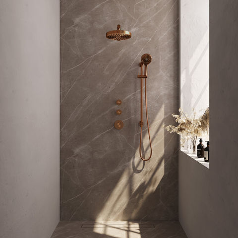 De set is uitgevoerd in geborsteld koper PVD, wat betekent dat de matte koperlook niet alleen opvalt, maar ook langdurig mooi en krasvast blijft. De PVD-coating zorgt voor extra bescherming van het oppervlak. Het geheel is vervaardigd uit duurzaam messing. De hoofddouche biedt een ruime waterstraal, terwijl de handdouche drie verschillende straalsoorten heeft waar je eenvoudig tussen wisselt met een druk op de knop. Dankzij de geïntegreerde glijstang kun je de handdouche flexibel verstellen. De doucheset wordt compleet geleverd met doucheslang, glijstang, handdouche en het benodigde inbouwdeel. Je kunt bij deze set twee wateruitgangen gelijktijdig gebruiken. Naast deze koper geborsteld PVD-variant is de set ook verkrijgbaar in andere afwerkingen zoals chroom, geborsteld goud PVD, geborsteld gunmetal PVD, geborsteld RVS PVD en mat zwart.